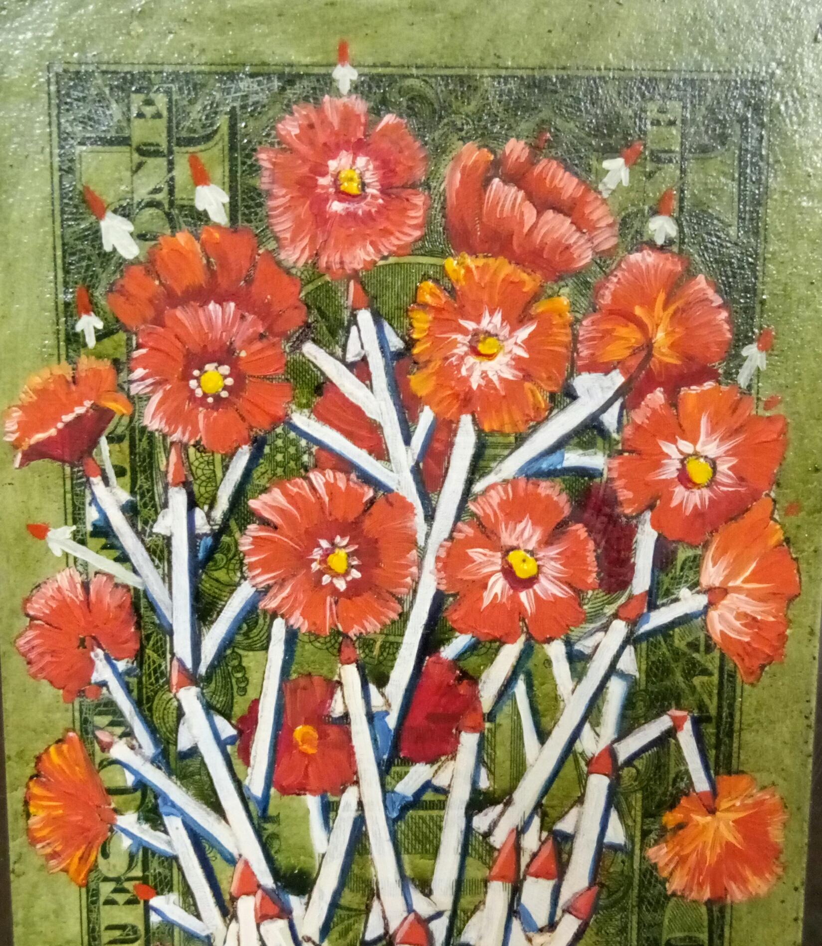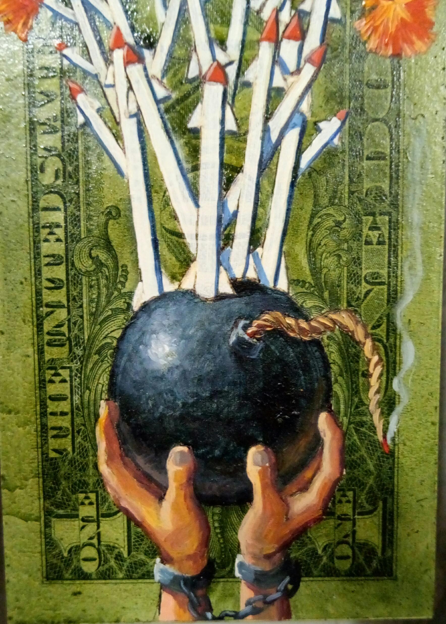 Flowers, chains, bomb, war, slavery, tyranny, apocalypse, rockets, Nostradamus, paintings on money, art made from money, art dollar, drawings on money. Banksy, Salvador Dali.