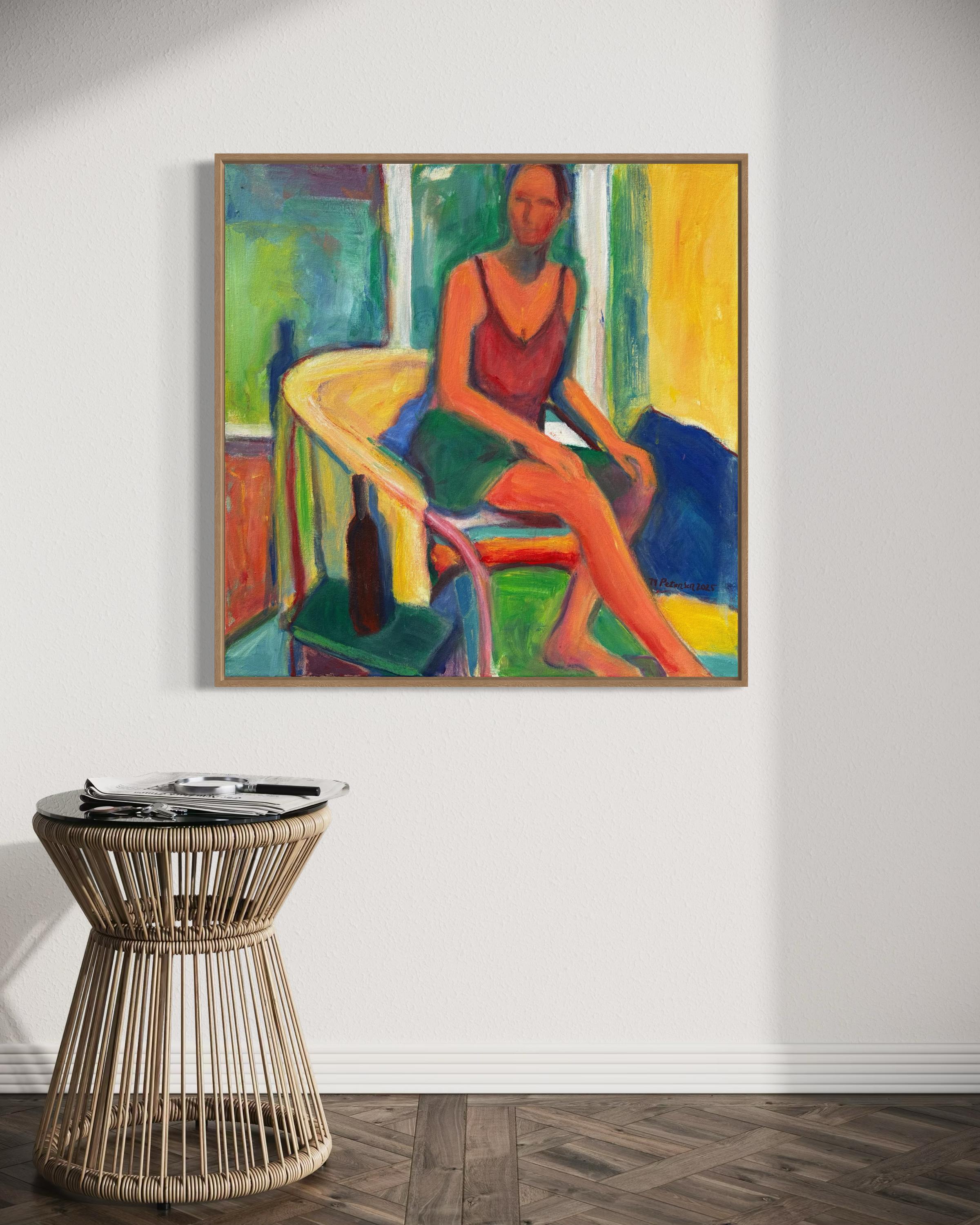 This contemporary figurative painting, "The Simple Things in Life," by French artist Nataya Mougenot, is part of her ongoing series dedicated to women. It captures a woman sitting at...