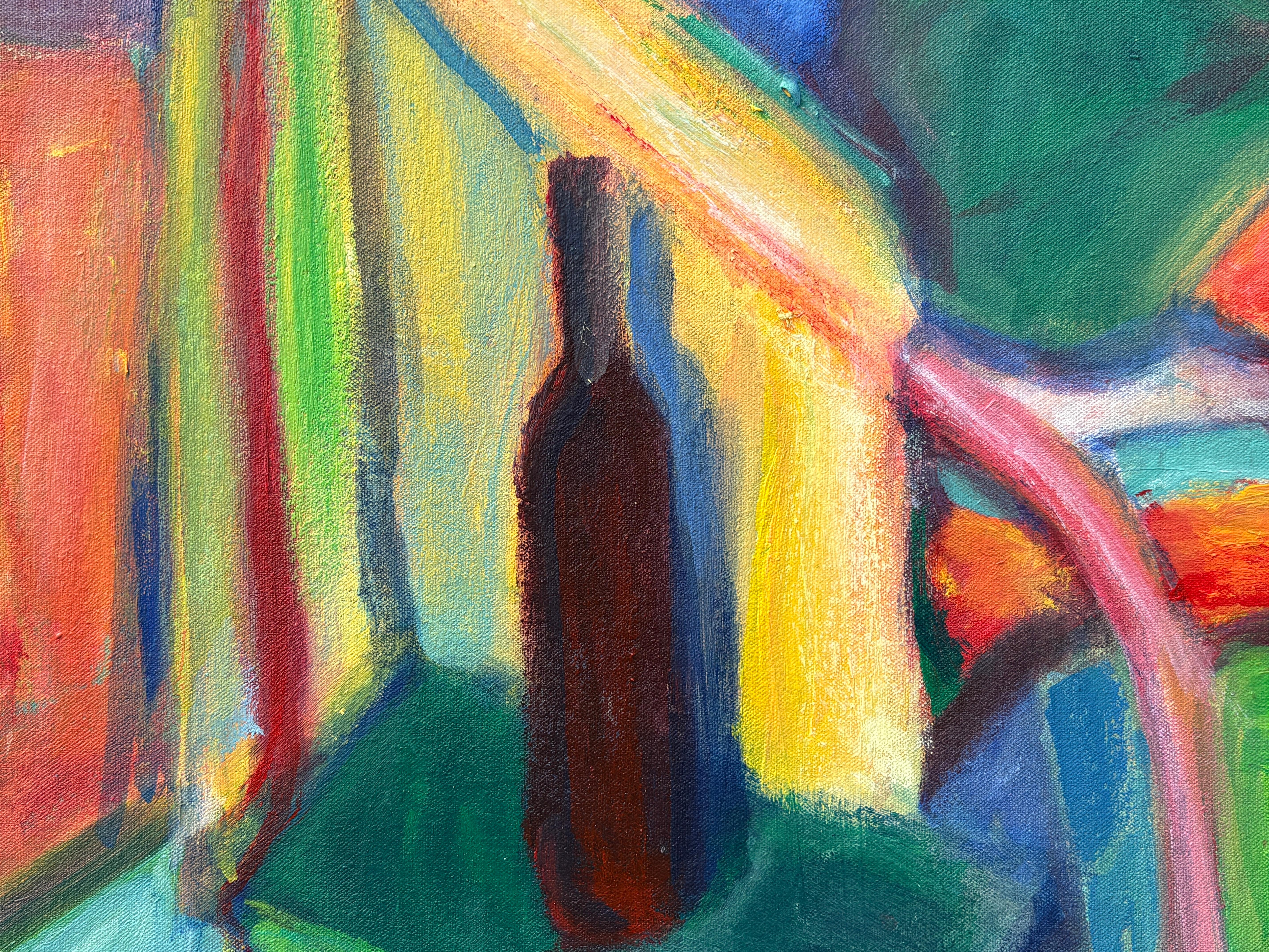 In “Awakening,” Maura Petersen captures a moment of quiet emergence with expressive color and fluid, softened forms. The seated figure, rendered in warm and cool hues, feels suspended between presence and introspection, the posture relaxed yet unresolved. The bottle in the foreground and layered interior elements suggest domestic familiarity, while the near-absence of facial detail pushes the viewer to locate emotion in body language and hue. The composition hums with energy just beneath the surface, like a thought not yet spoken.
