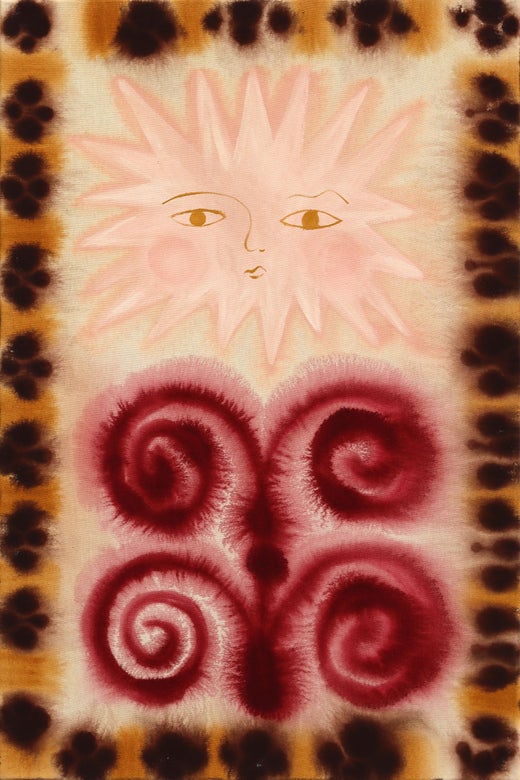 Meredith Walker’s "Sun Fern" is a radiant work of contemporary folk art that combines mystical symbolism with organic abstraction. This original acrylic and gouache painting on raw canvas features a luminous pink sunburst face gazing serenely outward, its warm blush tones and delicate expression exuding both tenderness and vitality. Beneath it, a pair of deep maroon fern-like spirals unfurl with rhythmic energy, echoing ancient motifs of growth, cycles, and renewal. The composition is bordered by an earthy frame of mottled browns and ochres, whose diffused edges enhance the work’s tactile, hand-painted quality. The overall effect is both grounding and transcendent, inviting viewers into a meditative dialogue with nature and celestial presence.