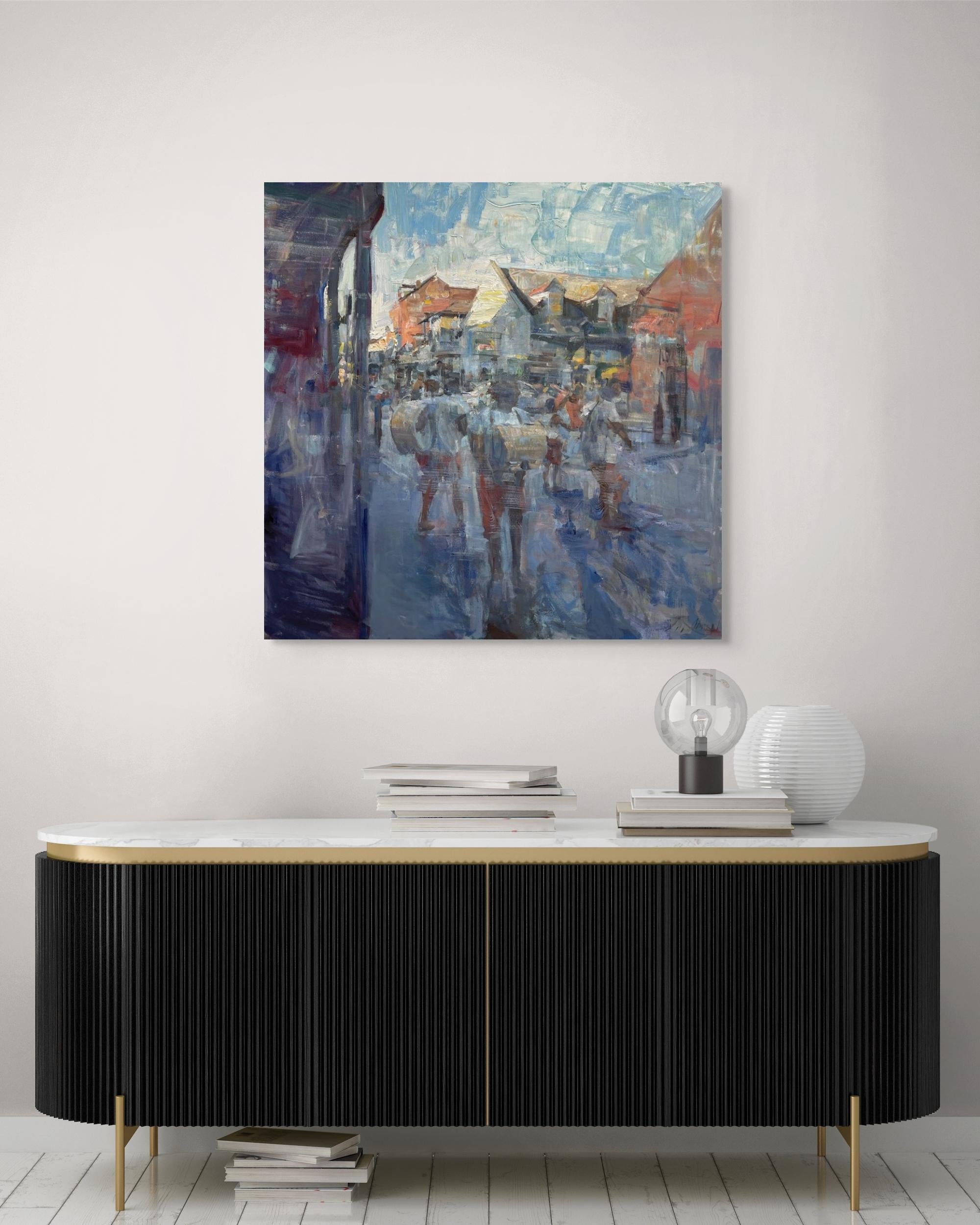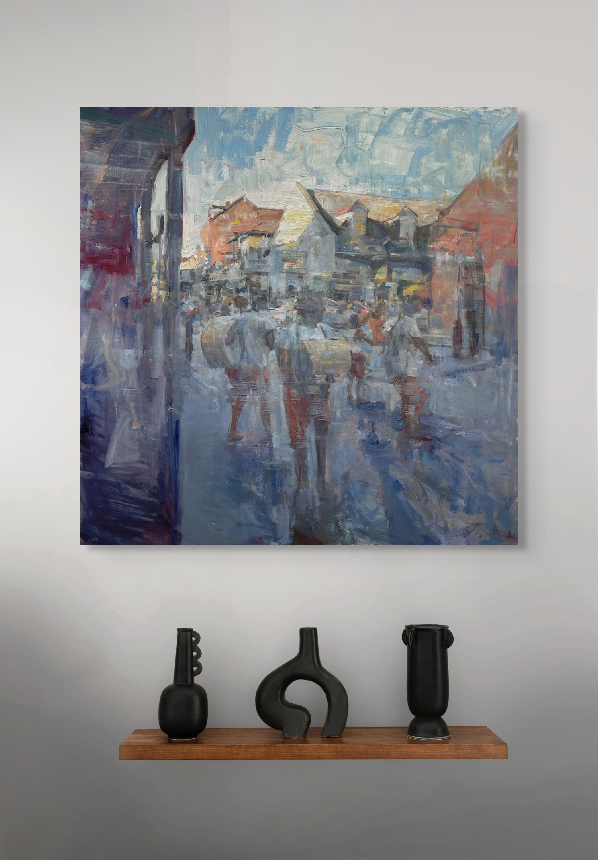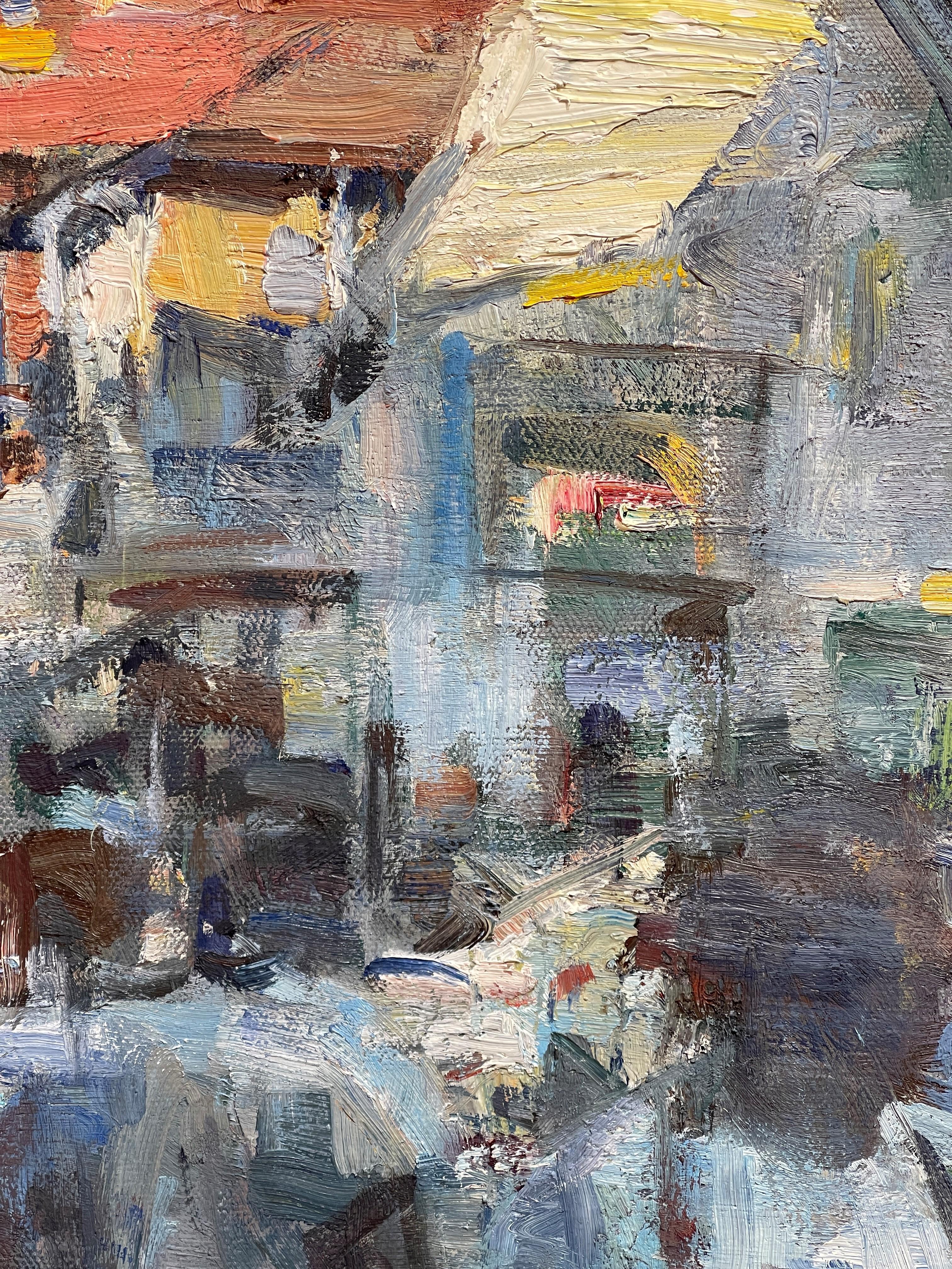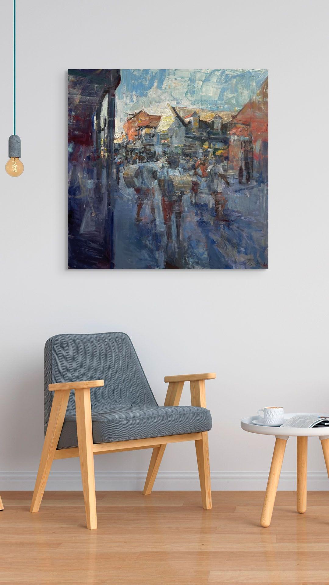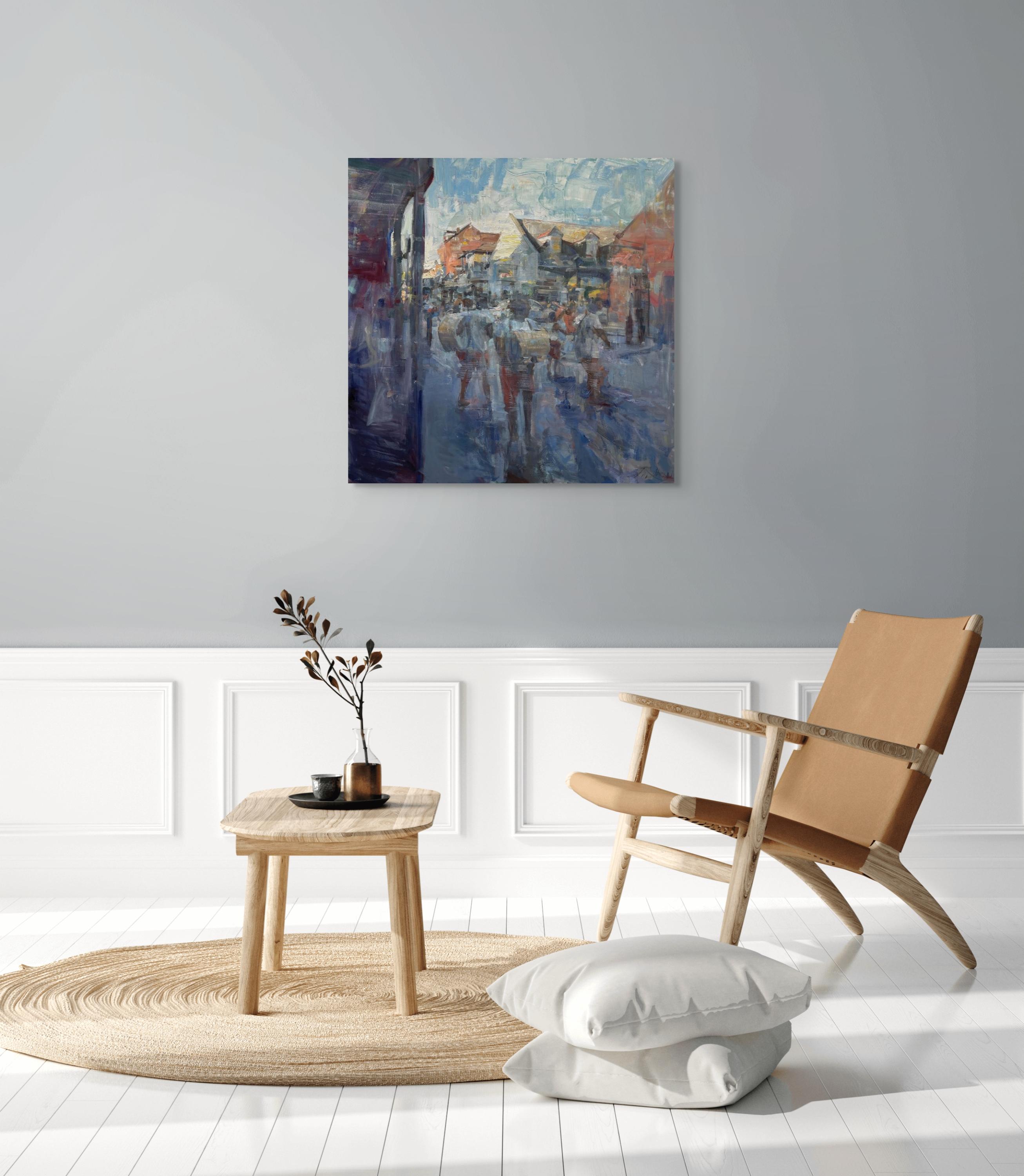 Christopher Clark's "Honfleur Street" is an original, handmade oil & acrylic painting that depicts an abstracted cityscape bustling with people and the sun brightly reflecting off of...