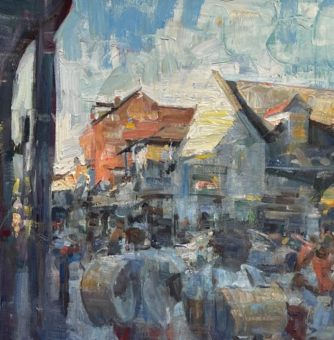 Christopher Clark's (US based) "Bustling Alley at Dusk" is an original, handmade oil painting that depicts a dreamy cityscape that features turn of the century buildings lining an alley where throngs of people gather at cafes and walk past in the light of the setting sun.