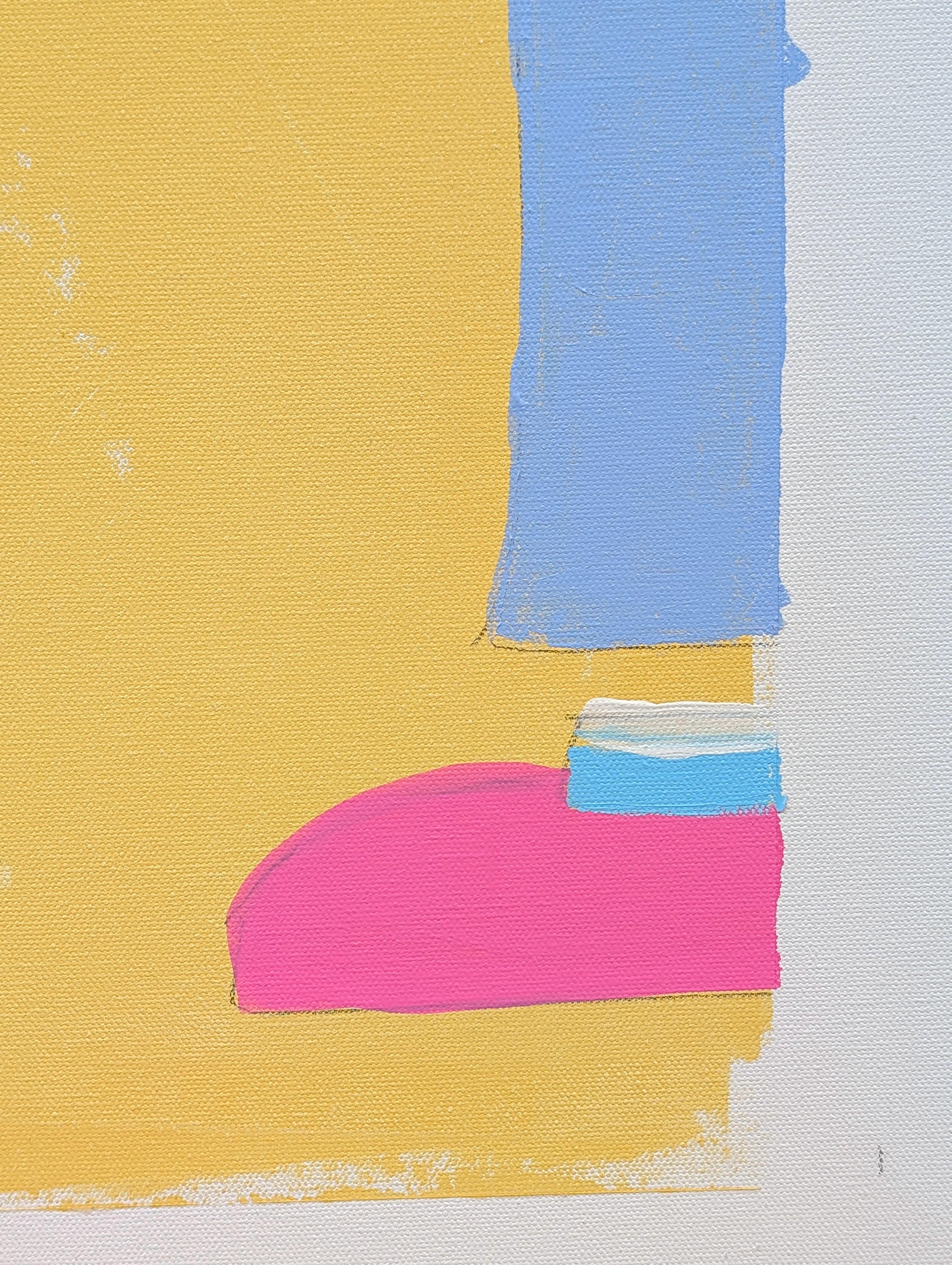 Colorful contemporary abstract painting by Houston-based artist Ramon Severino. The work features a central cactus in a Campbell's soup can with a pair of sneakers hanging off of it....