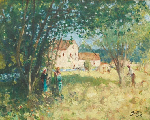 French artist Pierre Eugene Montézin, originally trained in decorative arts and mural painting under his father’s guidance. From the age of 18 he worked in a decorative atelier, painting floral panels and ornamental motifs. His exposure to the Impressionist movement inspired a pivot towards plein-air landscape paintings, setting him on the path to becoming a true Impressionist. Montézin passionately pursued Salon recognition for a decade; in 1903, he finally debuted at the Salon des Artistes Français after repeated rejections. Under the mentorship of Ernest Quost, he honed his drawing and painting technique, embracing a painterly style marked by spontaneous strokes and radiant light. Montézin enlisted during WWI and received the Médaille Militair for his service, spending significant time after the war in Dreuz and Moret-sur-Loing, painting landscapes in the tradition of Alfred Sisley with the influence of Claude Monet remaining present. Montézin remained a steadfast Impressionist, resisting contemporary movements like Cubism or Surrealism, and stayed devoted to natural, atmospheric subjects seen through ‘the heart’ as he reportedly told critic Louis Vauxcelles. He suddenly died in 1946 whilst painting Britany. Montézin’s work embodies a lifetime of devotion to light, landscape, and the authentic roots of Impressionism.