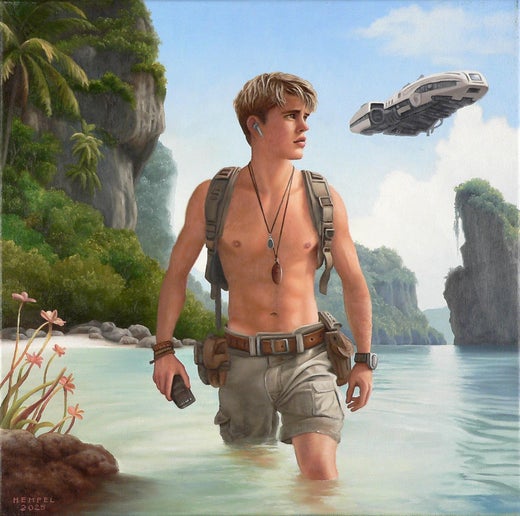 The twelve paintings in the exhibition are imaginary film stills based on on a Science Fiction screenplay, titled Regression, that was supposedly developed in the 1950s. The film was never made and, to Hempel’s knowledge, none of the script survived. As Hempel tells the story, a crew of astronauts travel to an exoplanet with a tropical Earth-like atmosphere and immediately get separated from each other when they set out to explore. Isolated, they start to rapidly grow younger. Wading in the water seems to slow the regression process. It is later revealed that the planet is a sentient life form that is purposefully regressing them as it can only communicate with minds that are free of dishonesty and aggression. By returning the astronauts to innocence, the planet hopes to establish contact. Constructed from memory, these paintings are Hempel’s musings on what the film might have looked like. There is a playfulness and and absurdity to the paintings. A spaceship hangs over the Hollywood sign next to two dramatically singular palm trees. The figures pose like 1950s film stars in the water while ships loom over their heads and steep cliffs rise behind them. Painted at an intimate scale ranging from 16x16 inches to 20x30 inches, the paintings draw on Hempel’s well-known practice of commenting on assumed narratives of masculinity in art and popular culture and the lack of representation of gay men. The figures are shirtless and seemingly unaware of the viewer but on a mission. Expressions of concern cross some of their faces while others are lost in thought - a surreal battalion of statuesque young men. Hempel is turning the pop culture trope of half dressed beautiful women on its head and depicting beautiful men in these paintings. With the lost film script as the framework, Hempel uses his immense technical skill to deftly recontextualize the male figure. Wes Hempel’s paintings forge a provocative dialogue between past and present - asking us to consider the ways in which the dominant narratives depicted in art and pop culture have presented a single viewpoint and lacked significantly in representation. Wes Hempel was born in El Monte, CA, in 1953. He received his BA from Cal State Northridge in 1985 and his MA from UC Boulder in 1988. He has exhibited extensively throughout the US since 1987 and his paintings are included in numerous private and public collections including the Denver Art Museum, Microsoft Art Collection, and the New Britain Museum of American Art (CT), among others. He lives and work in Colorado.