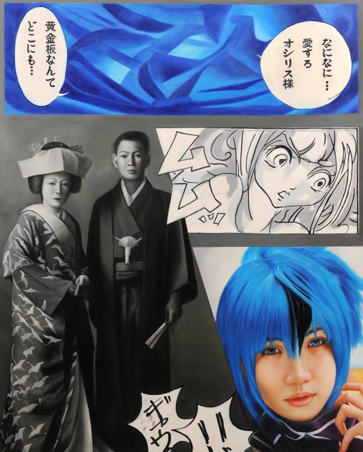 His signature works are compelling portraits of Japanese women from various times. Yoshimura skillfully merges ancestral black-and-white photographs with contemporary imagery of Harajuku girls. This union of past and present on canvas is further accentuated by the addition of simple manga character sketches, symbolizing the bridging of historical and modern narratives.