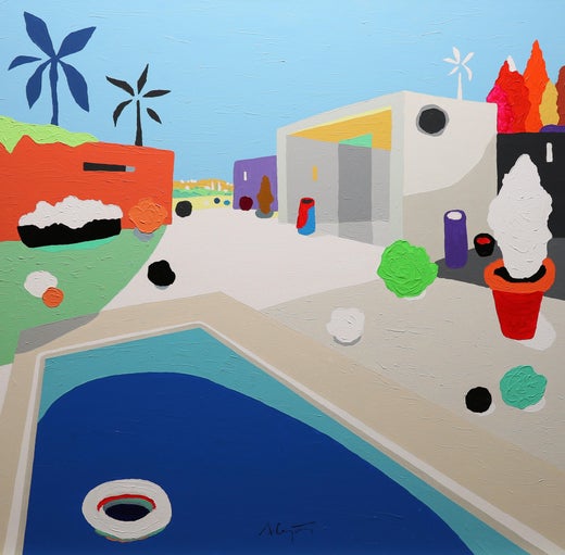 Graduate in interior design. Technician in industrial design. In the painting of Alejos we can see influences of various stylistic trends, such as pop art, Post-Impressionism, and Japanese ukiyo-e. They are spots of pure, distinct colors, playing together harmoniously creating subtle landscapes. The works bring back memories of past masters including 19th-century Japanese ukiyo-e artists Hiroshige and Hokusai, as well as the colorful landscapes of European artists Henri Matisse, Paul Gauguin and Vincent van Gogh. Alejos’ colorful, reductionist geometric forms also elicit the verdant landscapes of 20th century pop artist David Hockney. “It is primarily a lyrical, imaginative, lively, evocative and particularly striking painting, with which this artist reminds us that art is above all creation, interpretation, not a simple copy of reality, emphasizing that the world must represented, not only as it is, but also how it feels”. Carlos Barcón, art critic, member of the Royal Galician Academy of Fine Arts
