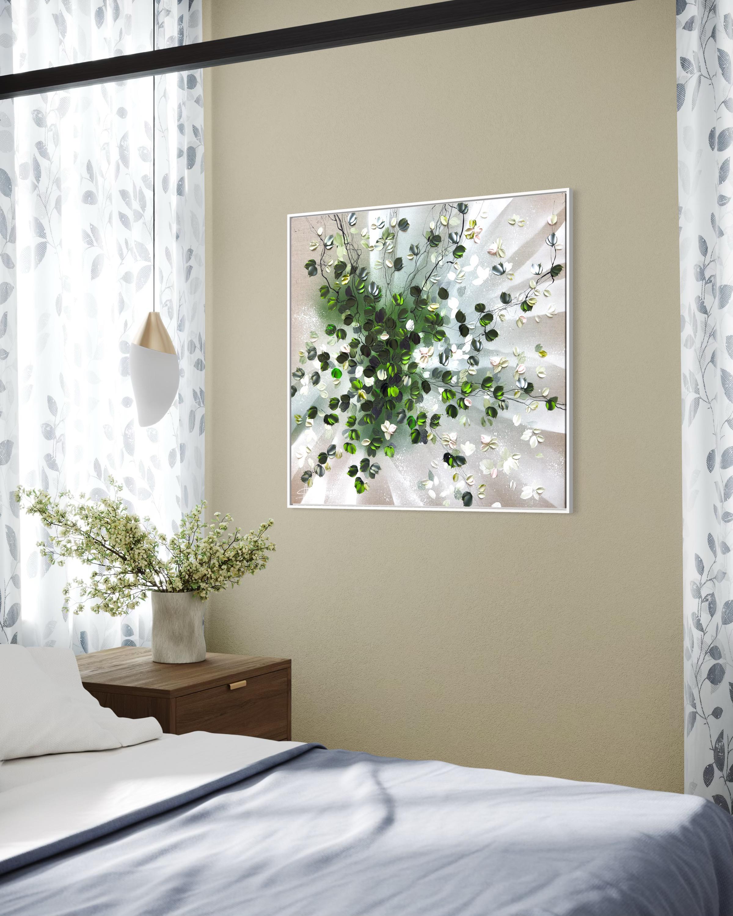 In Petals in Light, branches and leaves unfurl across a linen background, surrounded by delicate petals in soft white and gentle pink. A radiant play of light spreads from the center, with shades of green, and subtle grey creating both contrast and harmony.