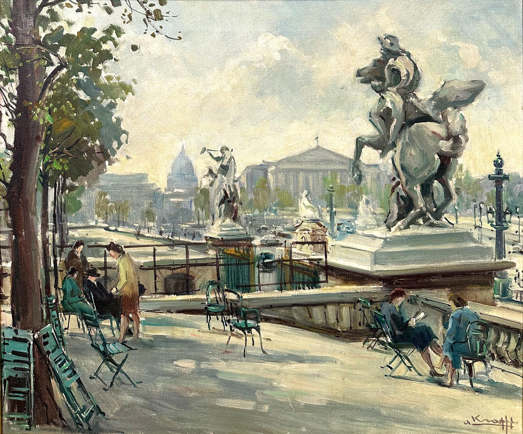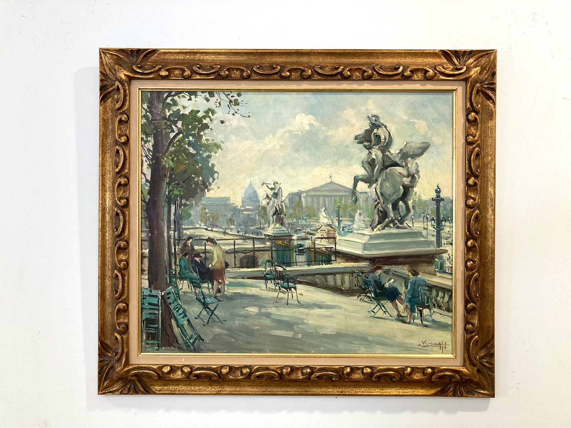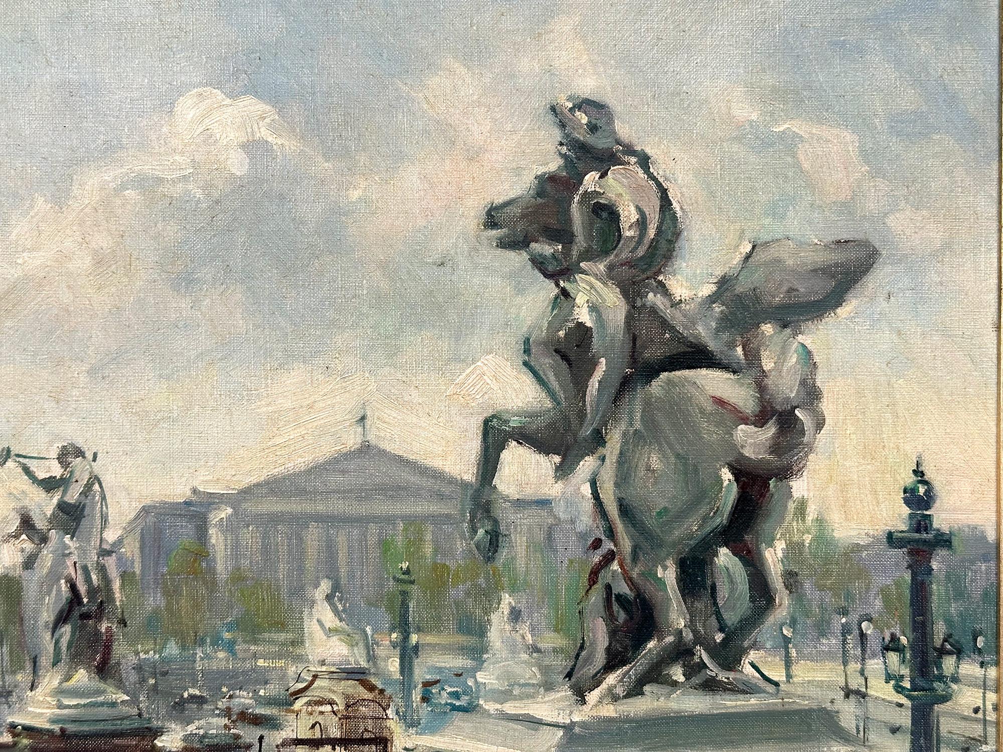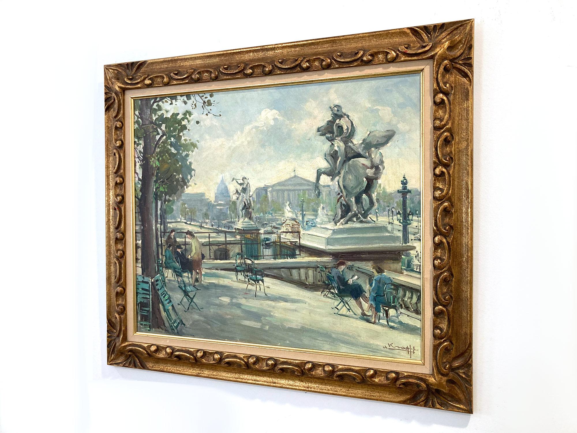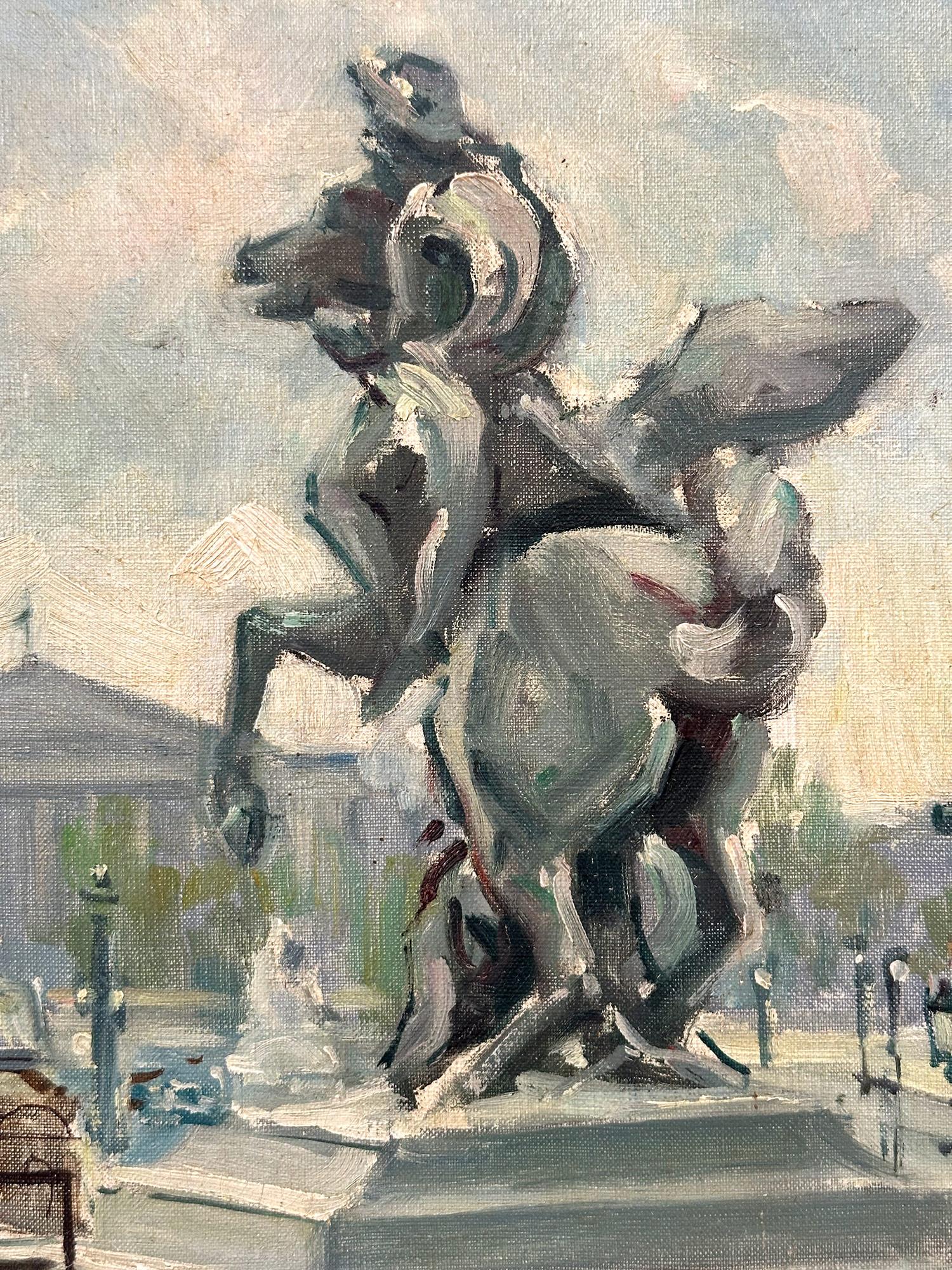 Andre Krafft"Near the Place de la Concord" Impressionist Oil Painting w Equestrian StatuesMid-20th Century