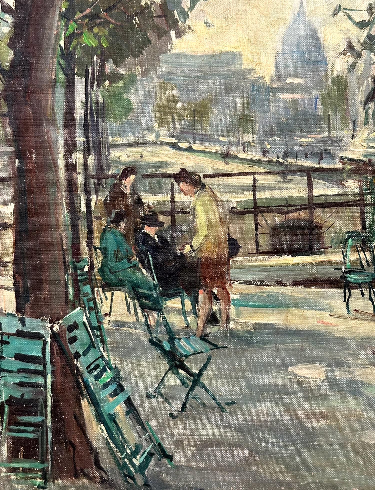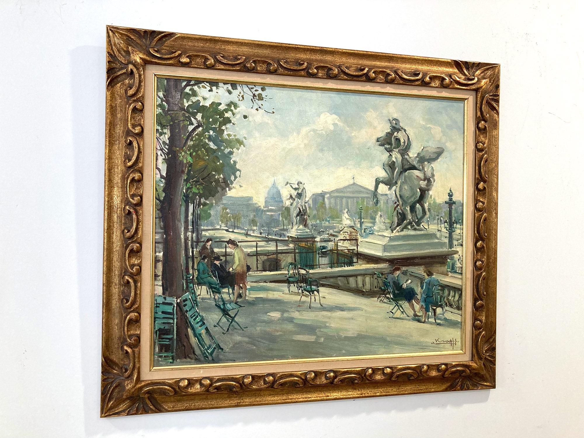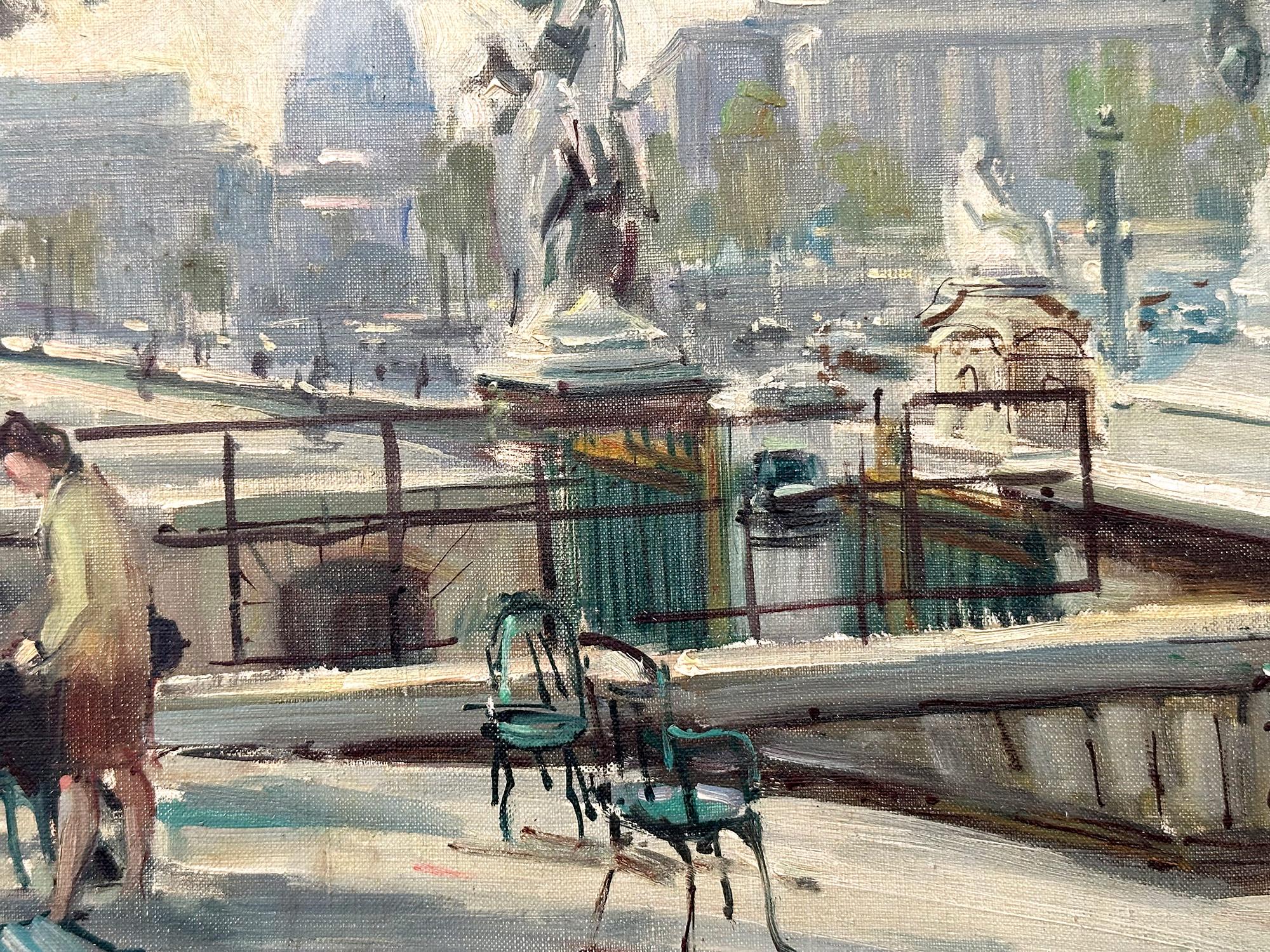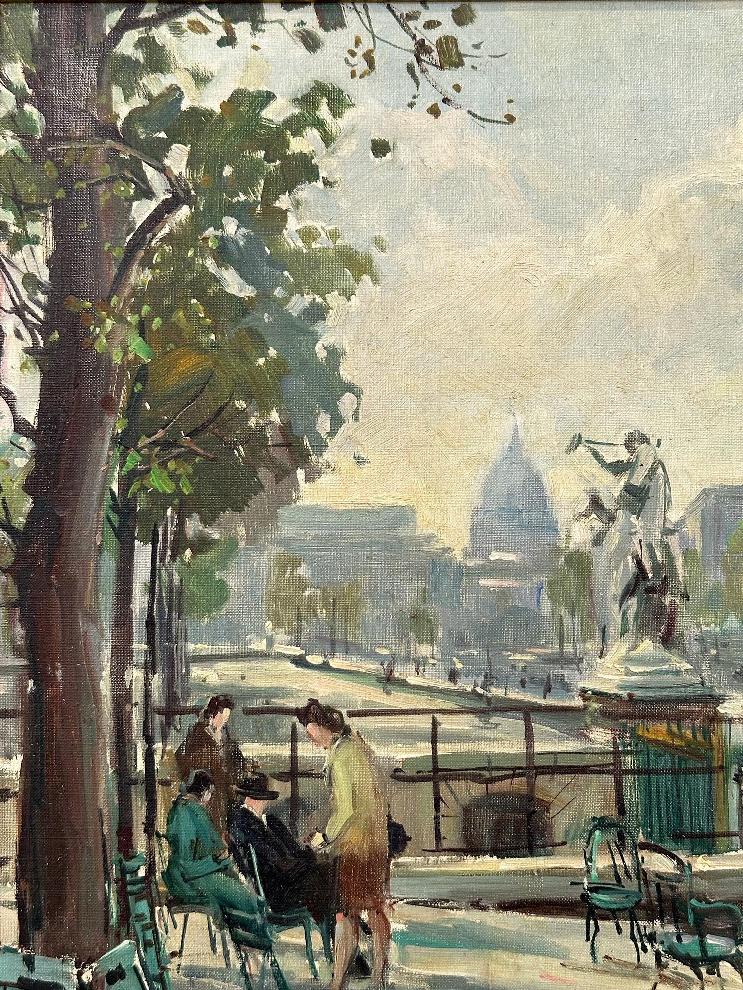 This painting depicts a tranquil outdoor scene set in a Paris near the Place de la Concord featuring a promenade with large equestrian statues prominently displayed. The statues, mounted on rearing horses, are positioned on elevated platforms and add a sense of grandeur to the composition. In the background, we see the Place de la Concord marking such a historical setting. The sky is depicted with warm light illuminating the scene, creating a peaceful atmosphere. In the foreground, several people are seated on green folding chairs, engaged in reading and conversing. The figures are dressed in mid-20th-century attire, adding a nostalgic feel. Trees with lush green foliage frame the left side of the painting, casting gentle shadows on the ground. The overall color palette is a mix of soft greens, blues, and earthy tones, rendered in an impressionistic style with visible brushstrokes, giving the scene a lively yet tranquil quality. The piece is signed by the artist lower right and it comes housed in a wonderful wood carved antique frame and hanging wire on verso ready to be displayed.