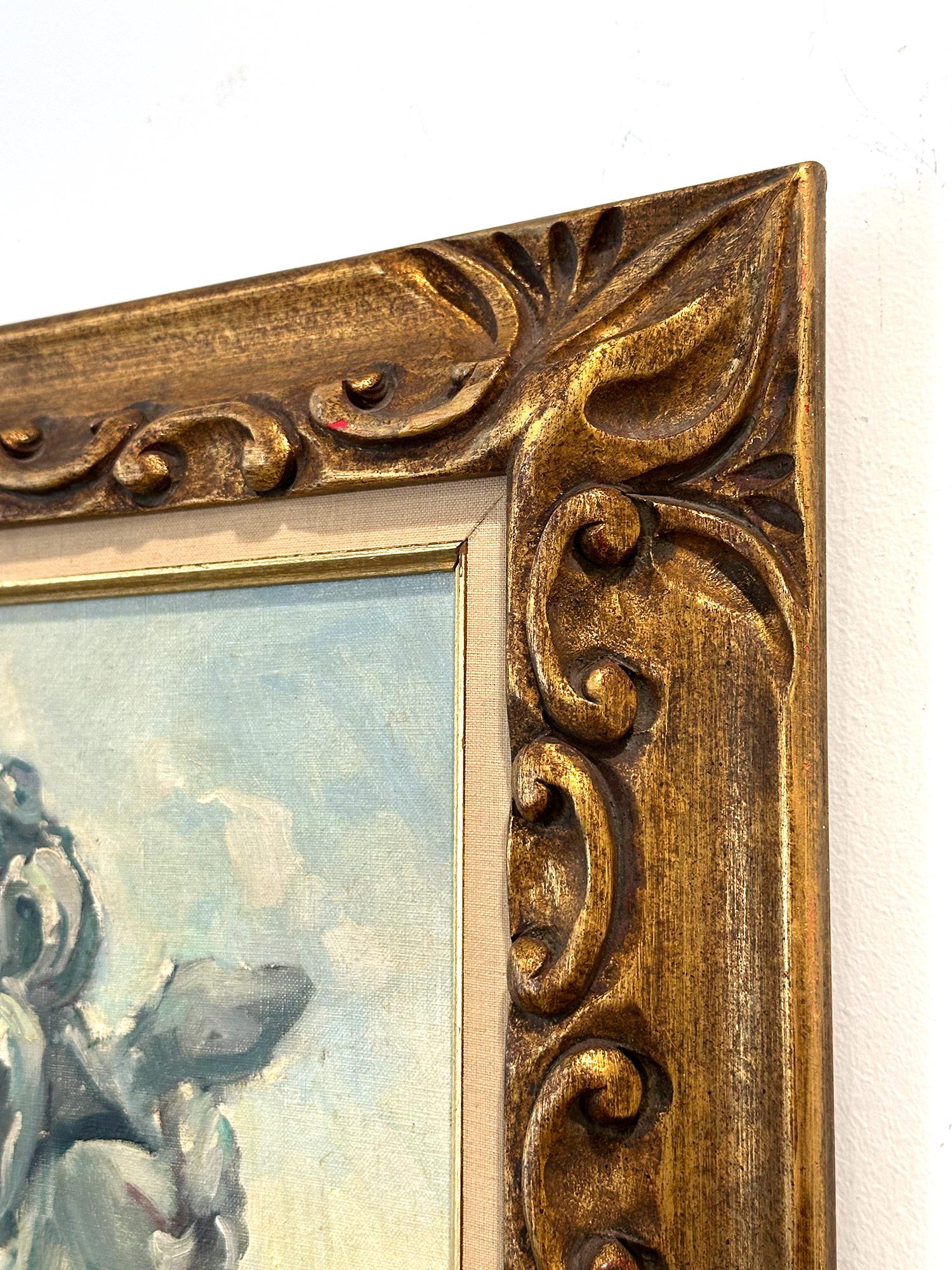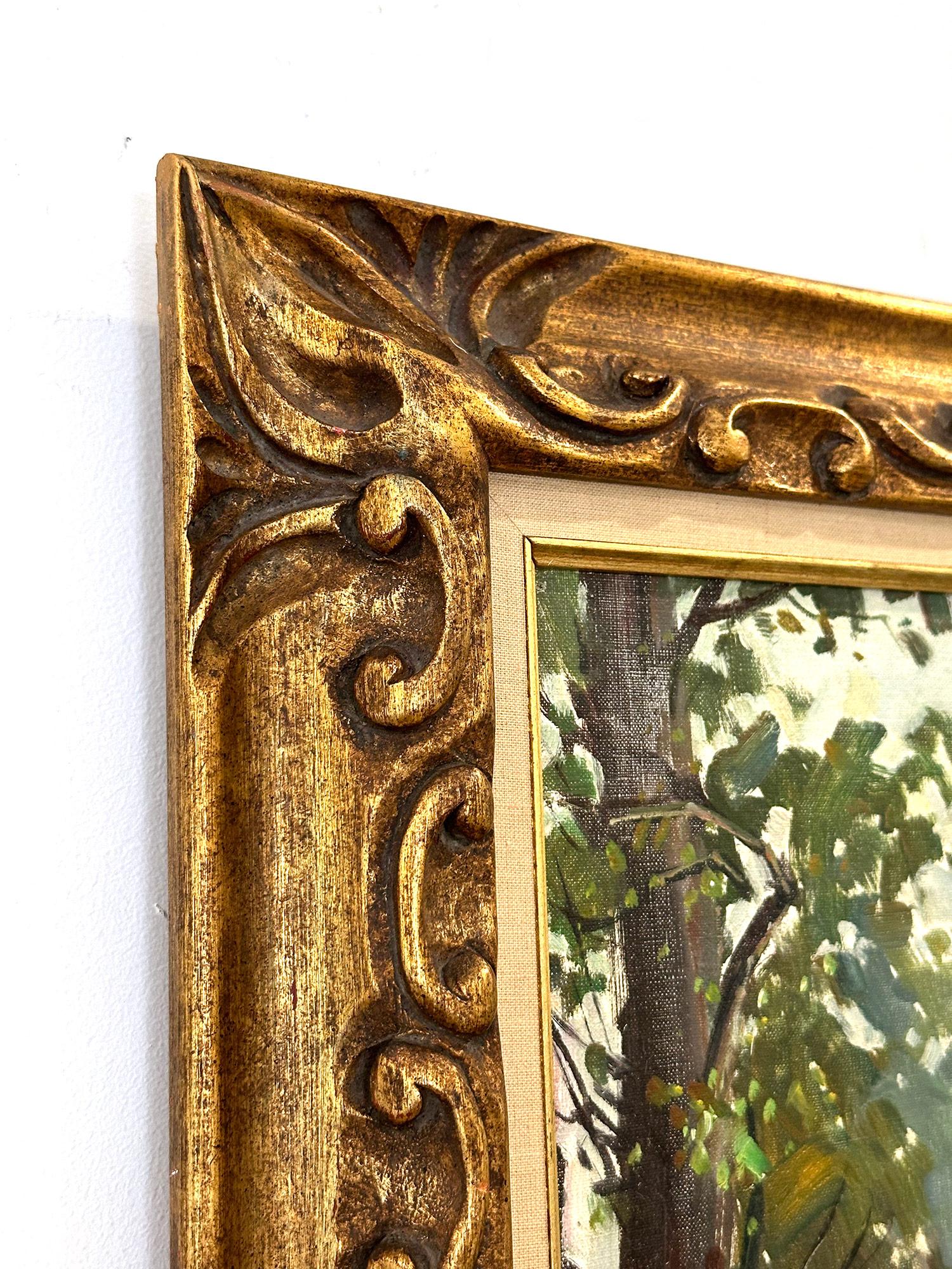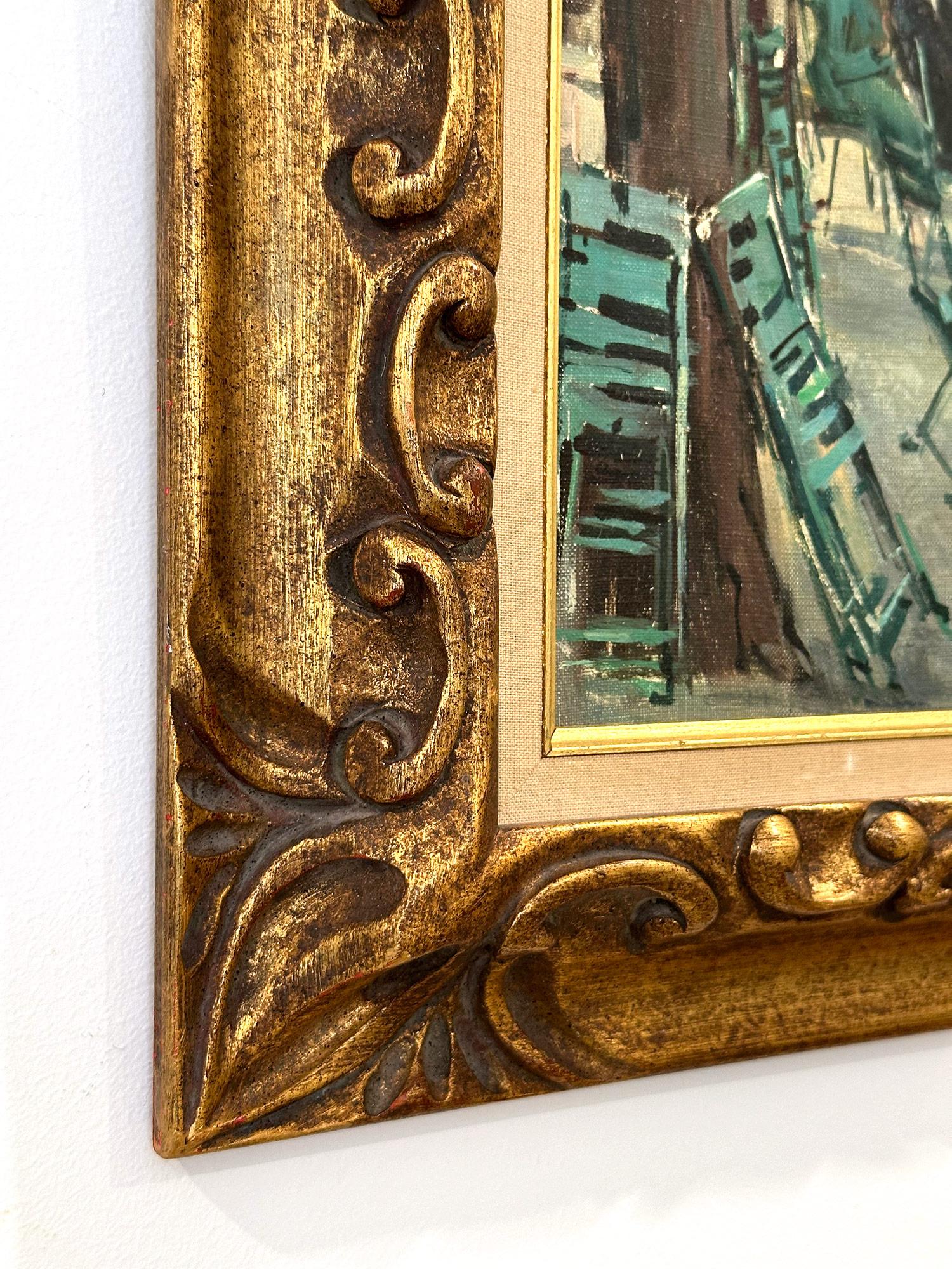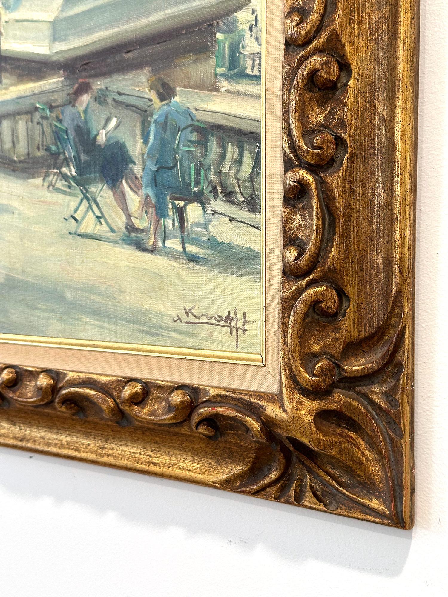 This painting depicts a tranquil outdoor scene set in a Paris near the Place de la Concord featuring a promenade with large equestrian statues prominently displayed. The statues, mounted on rearing horses, are positioned on elevated platforms and add a sense of grandeur to the composition. In the background, we see the Place de la Concord marking such a historical setting. The sky is depicted with warm light illuminating the scene, creating a peaceful atmosphere. In the foreground, several people are seated on green folding chairs, engaged in reading and conversing. The figures are dressed in mid-20th-century attire, adding a nostalgic feel. Trees with lush green foliage frame the left side of the painting, casting gentle shadows on the ground. The overall color palette is a mix of soft greens, blues, and earthy tones, rendered in an impressionistic style with visible brushstrokes, giving the scene a lively yet tranquil quality. The piece is signed by the artist lower right and it comes housed in a wonderful wood carved antique frame and hanging wire on verso ready to be displayed.
