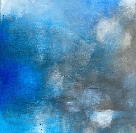 "Mystic Waters" is an abstract painting by Rebecca Sobin executed in oil, cold wax medium on a cradled wood panel. The painting measuring 20 by 30 inches.