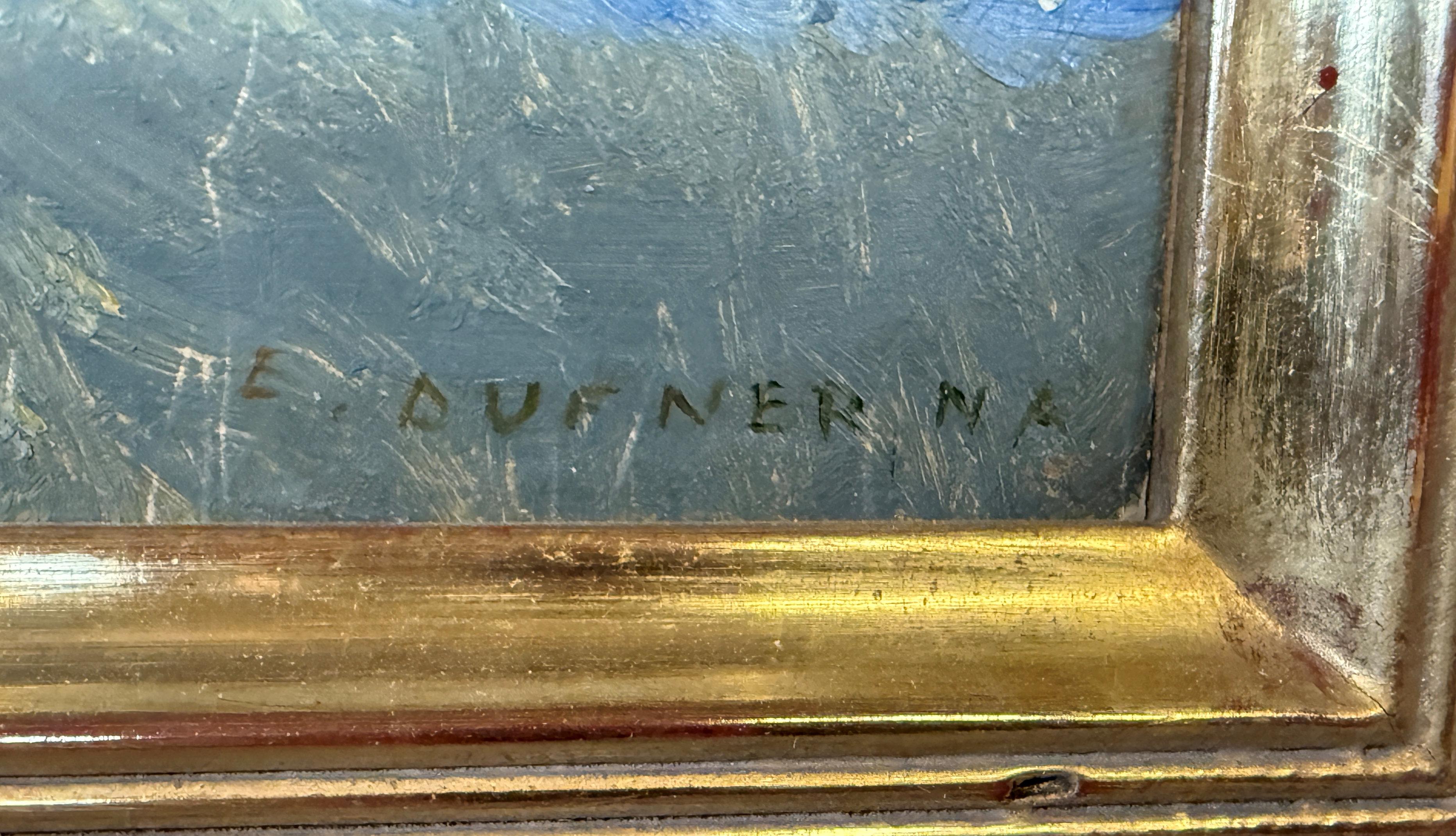 Edward Dufner was dubbed the, “Painter of Sunshine” by his peers due to his masterful rendering of atmospheric effects. His paintings are highly sought after for their luminous portrayal of sunlight infused in nature and his subjects convey a strongly romantic, almost symbolist sentiment. The painting, Evening Song, ranks among the most important American works of the early 20th century. The arrangement of the composition is derived from the Classical three-part division of the picture plane. The father of Modernism, Poussin, explored these compositional techniques in the 17th century, which Dufner studied thoroughly during his time in Paris. The Post-Impressionist elements are evident in the foreground, where a Divisionist technique is used to create the illusion of light flickering across gently rippling water. Dufner did not approach this style in the mathematical manner of Seurat, but rather studied color theory in order to express it intuitively. In the middle ground and immediate foreground of the piece, he applied a vigorous, agitated brushstroke, juxtaposing primary colors with lavender and pink hues. This method creates the sensation of slowly fading light, as one would observe in the early evening. His stunning ability to convey the exact time of day and atmosphere of the setting is unparalleled by his contemporaries.