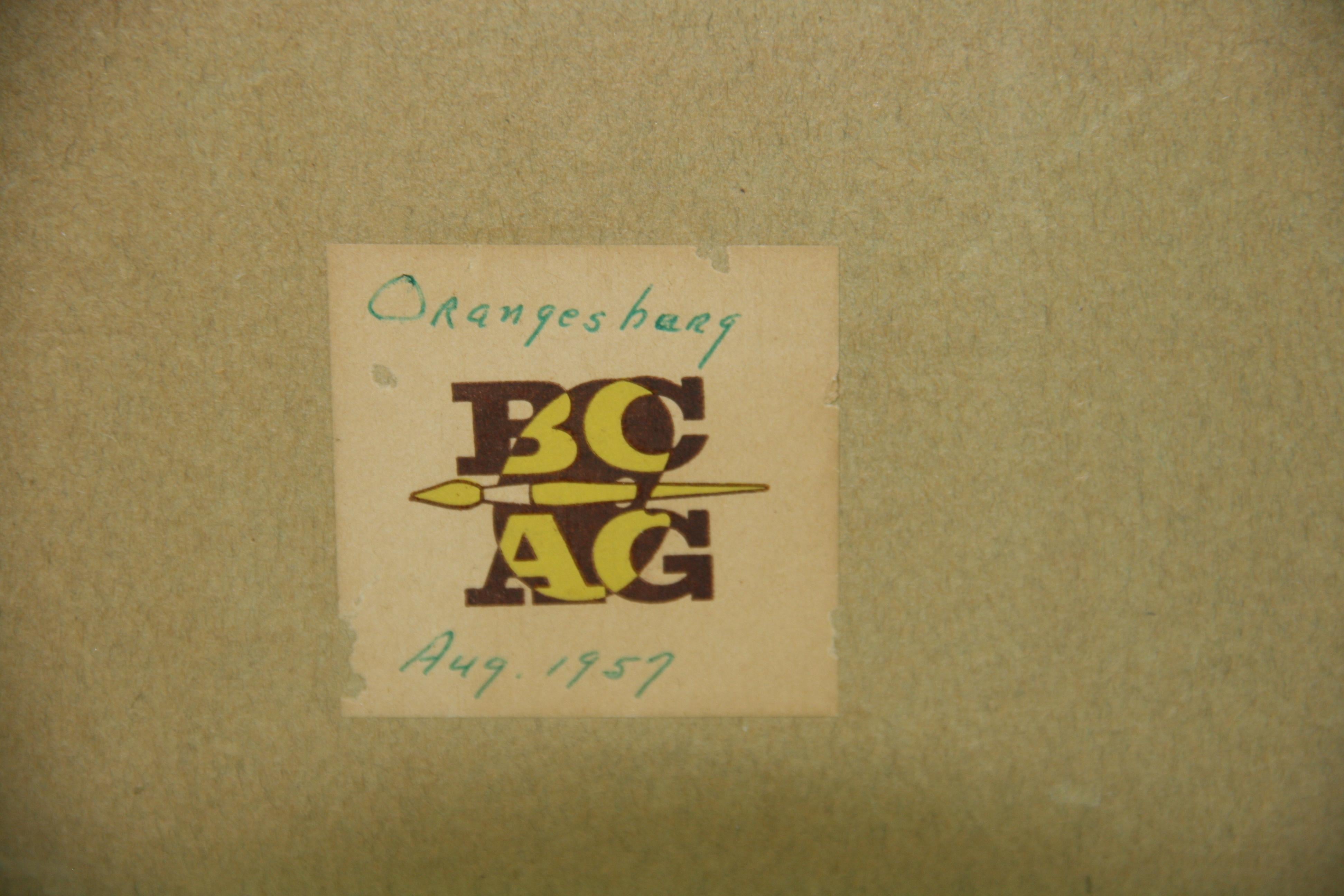 Landscape in oil. Signed lower right and dated '49. Presented in a gilt-effect frame with a white internal window. On board.