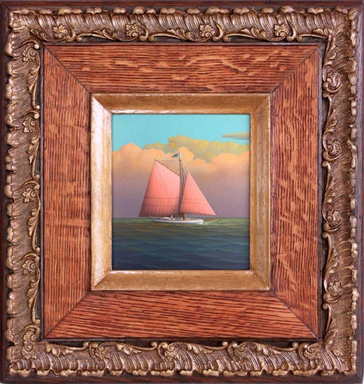 George Nemethy finds his inspiration in moments of quiet and solitude. Where he finds himself one with the sea and the sky and the tranquil world which he freely escapes to. Trained from an early age by his father Albert Nemethy, a world-renowned painter known best for his large scale steamer boats, George found and nurtured his passion for miniature sailboats early in his life. This passion translates beautifully into his sought after sails on the sea, where so many are captivated by the absolute tranquility of his pastoral waves and puffed clouds. George creates these fine jewels with a surreal motivation, aimed to breathe a uniqueness in every work by use of color combinations and highlights from the sun. We are enthralled by the finite details which surprises and delights, exploring these canvases with magnifying glasses, discovering just the utmost care into detail that truly has us all in awe. From the effortless shadows to the finest details of the tiny people that sail these magical boats, George has packed so much into such a small board, that will have you mesmerized and enjoying every inch instantly. This piece is signed with the artist's monogram lower left and it comes housed in a beautiful oak antique style wood frame with dark gold tone ornaments and hanging wire on verso ready to be displayed.