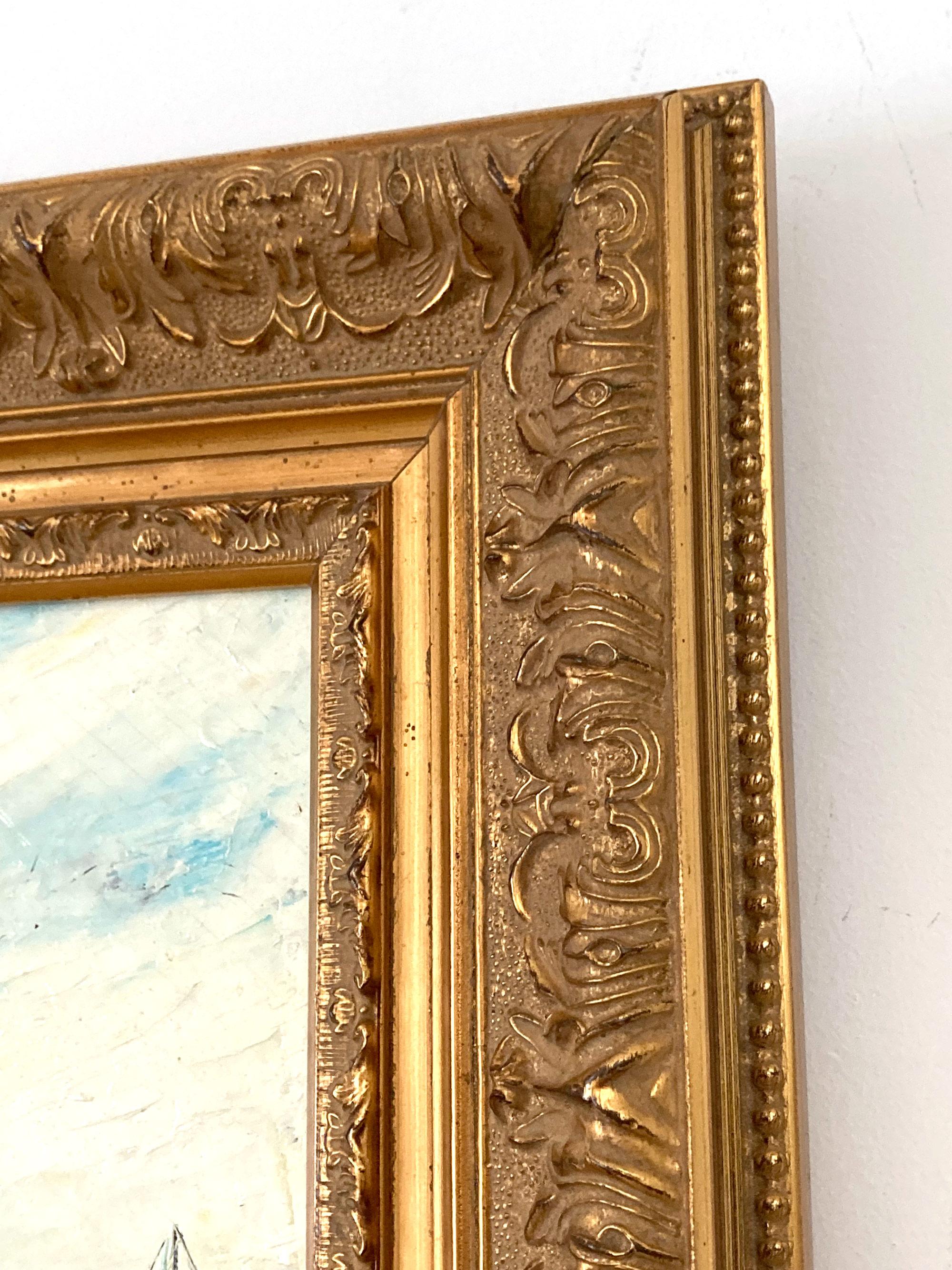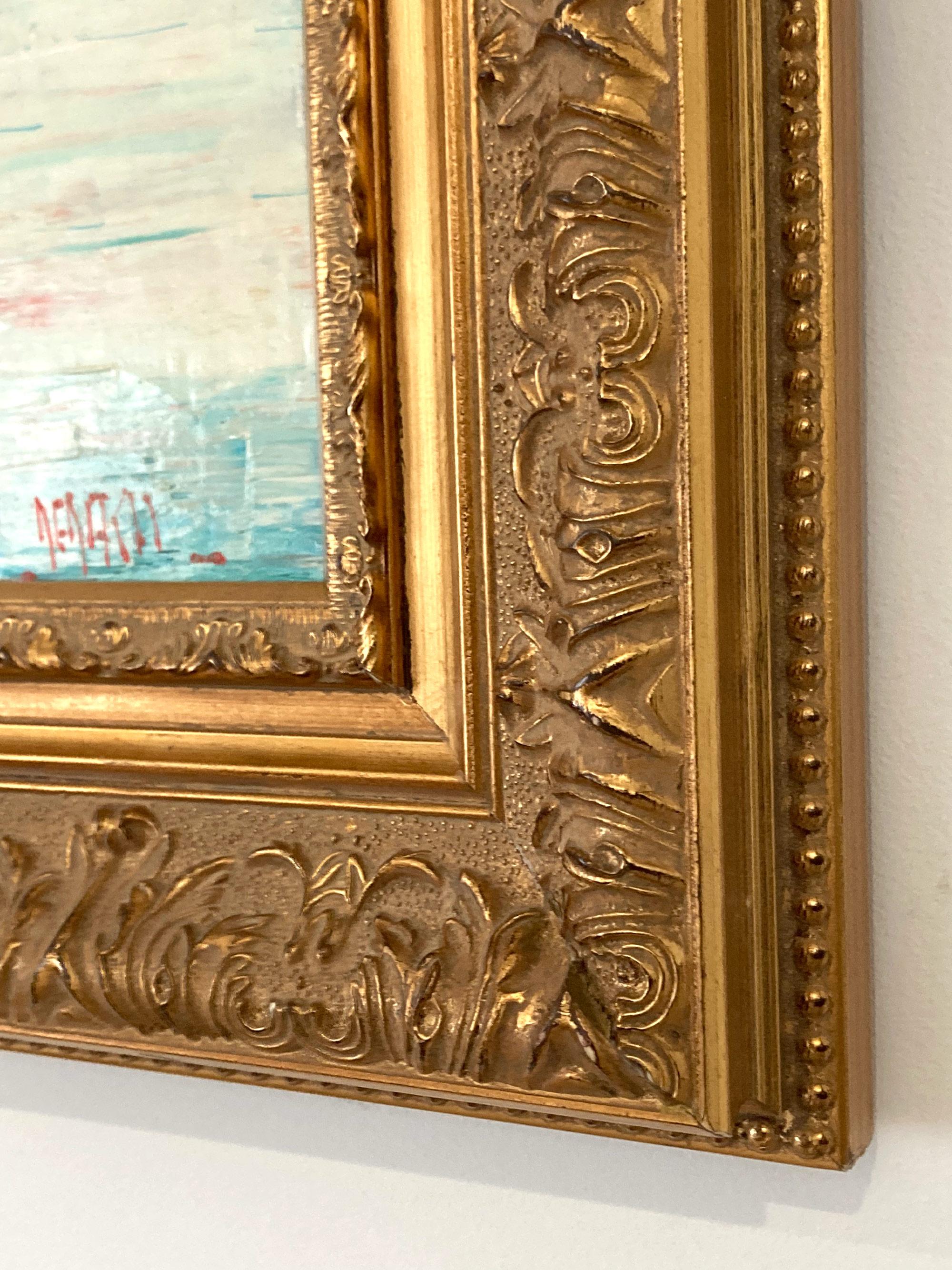 This work by Lucien Adrion is a wonderful representation of his Post-Impressionist works at the seashore by the French Riviera. Using a bright palette of colors, Adrion executes this piece with much attention to detail with many boats situated along the marina. There are palm trees and buildings placed in the distance, as we can feel the warmth of the sun contrasted with the cool breeze of the water. The boats are wonderfully executed by the artist in a very whimsical way that leaves us with an essence of enjoyment from that sunny day at the marina. As this tourist destination was a favorite of the artist to find inspiration and highly attractive subjects and compositions to represent, we can find several of his works like this subject and others. The piece is signed by the artist lower left and it comes housed in a French giltwood frame with linen liner and hanging wire on verso ready to be displayed.