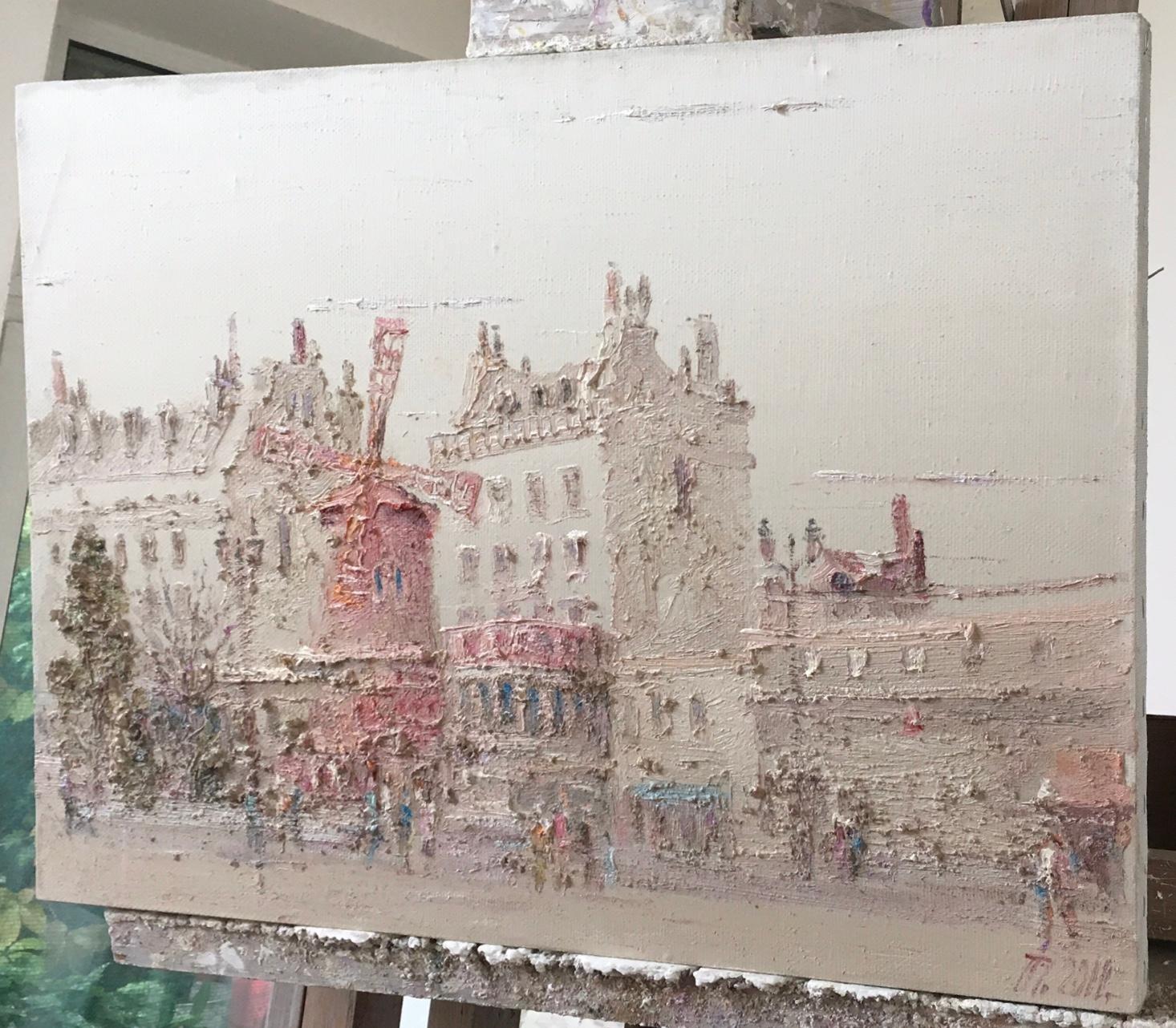 This painting depicts a peaceful cityscape in soft, light tones. In the center of the composition stands a red windmill — an accent among the pale facades of old houses. Its shape and color immediately attract attention, creating a warm contrast with the surrounding architecture.