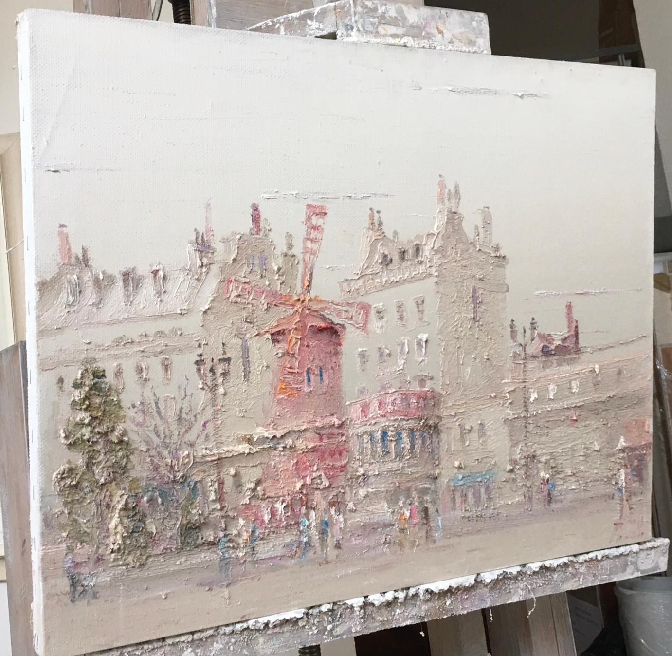 Wonderful scene of the Moulin Rouge cabaret nightclub at Place Pigalle in Paris. Painted in wonderful moody blue and red colors.