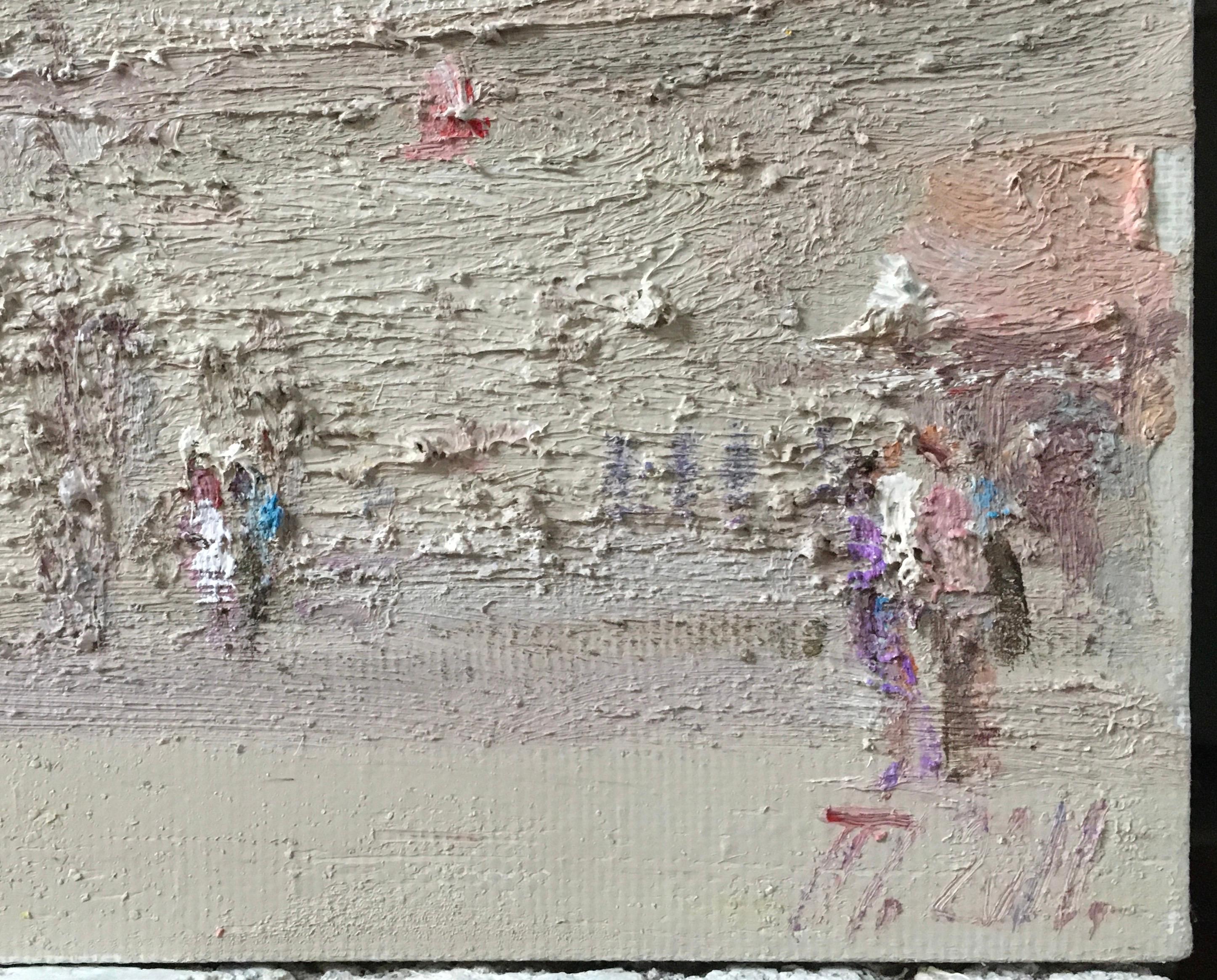 The artist uses thick brushstrokes, giving the surface of the canvas a distinct texture — as if the city were painted not only with paint, but also with the air itself. In the foreground, several small figures of people can be seen, adding life and movement to the scene. The atmosphere is calm, a little pensive — reminiscent of Paris in the morning, when the city is just waking up and the light gently falls on the walls of the houses.