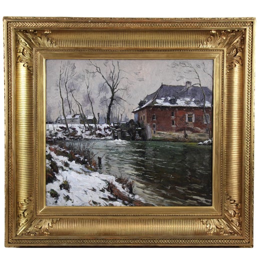 American Impressionist Earnest Albert Landscape Oil Painting Red Mill Winter