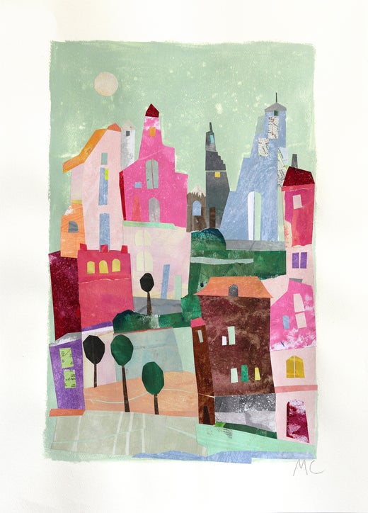 Maria C Bernhardsson's original artworks are influenced by the architecture and geometry of houses. Born in Sweden, Bernhardsson travels the world photographing and sketching houses to use as inspiration for her canvas and paper artworks. Her paintings include subtle layering of colors and shadows of individual houses in conjunction with the overall feeling of gazing at a collection of buildings in an abstract urban landscape. Playful details such as flowers and animals complete her one-of-a-kind artworks and make the houses feel like homes.