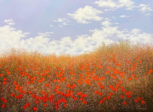 "Chanson d'été" (Summer Song) is a piece in the artist's preferred format. This canvas is a dedication to the patience and technique that Patrice Marchal possesses. He shows meticulousness in this accumulation of poppies overhung by a pure and light soothing sky. Here, we feel the serenity and the love for nature that the artist likes to share with us.