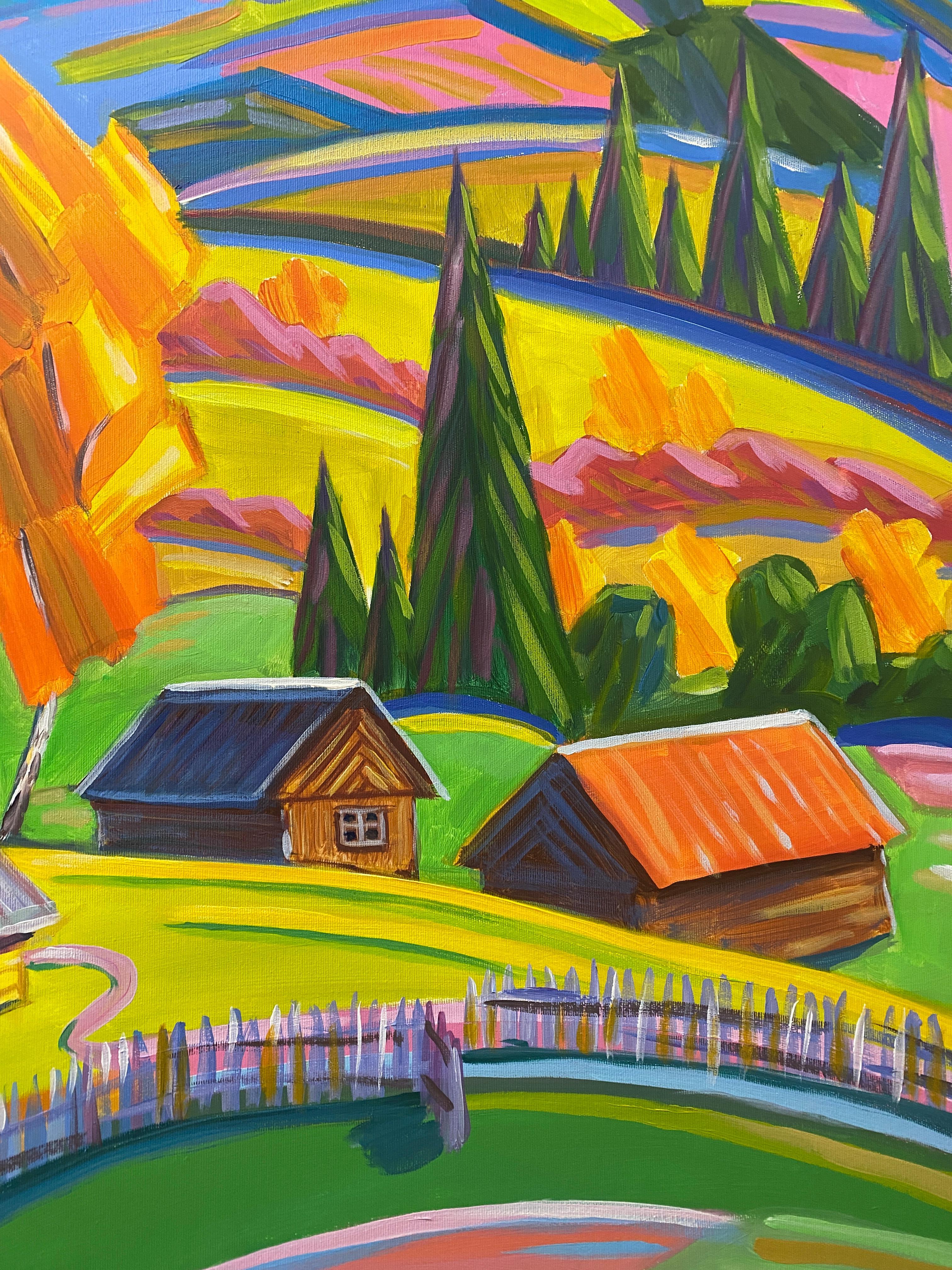 This colorful landscape is painted in the artist's signature style, which he began developing in 2015. The painting depicts autumn mountains. The colors convey the mood and spirit of...