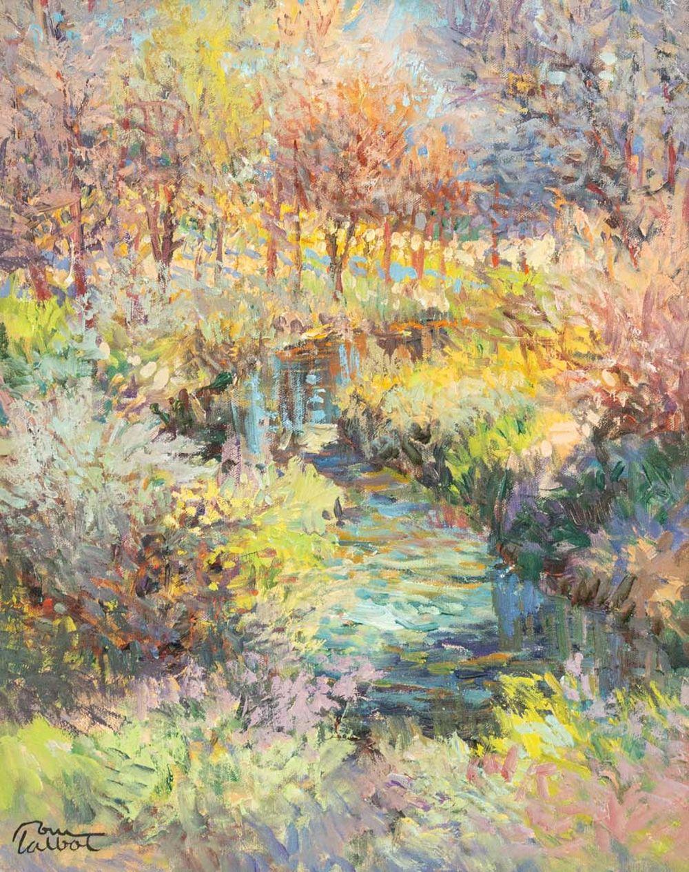 Stanley Sporny (American 1946 - 2008) A view into a stream with overhanging branches reflected in the water. A beautiful oil painting that explores the stream bottom as well as the ...