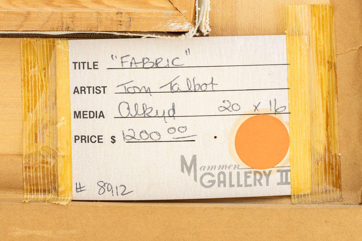 Tom Talbot (American, 1936-2003), "Fabric", Oil on Canvas, signed lower left, Manmen Gallery label to the reverse, giltwood frame. Image: 20" H x 15.5" W; frame: 24.25" H x 20.25" W. Provenance: From a New York City Collection.