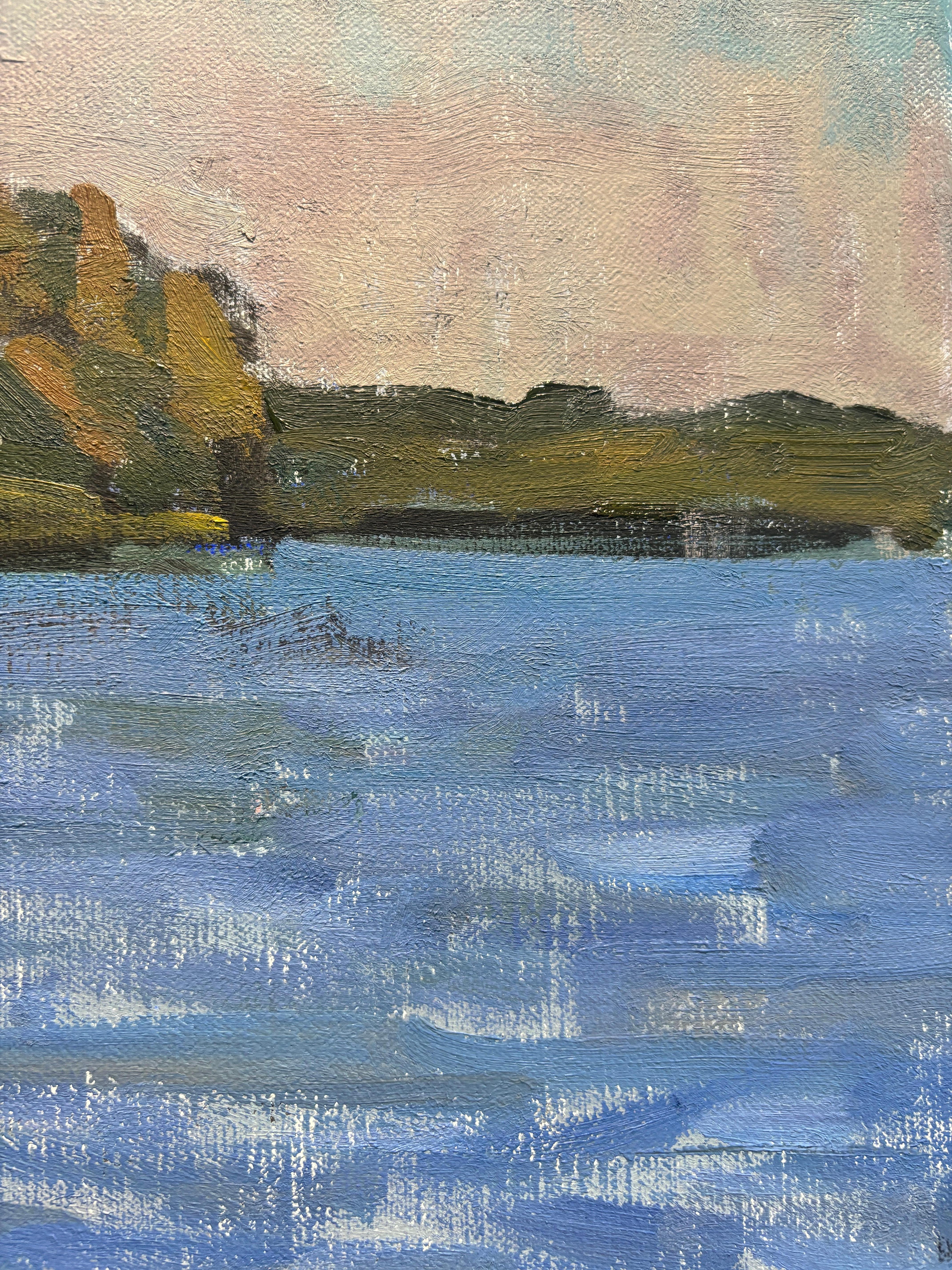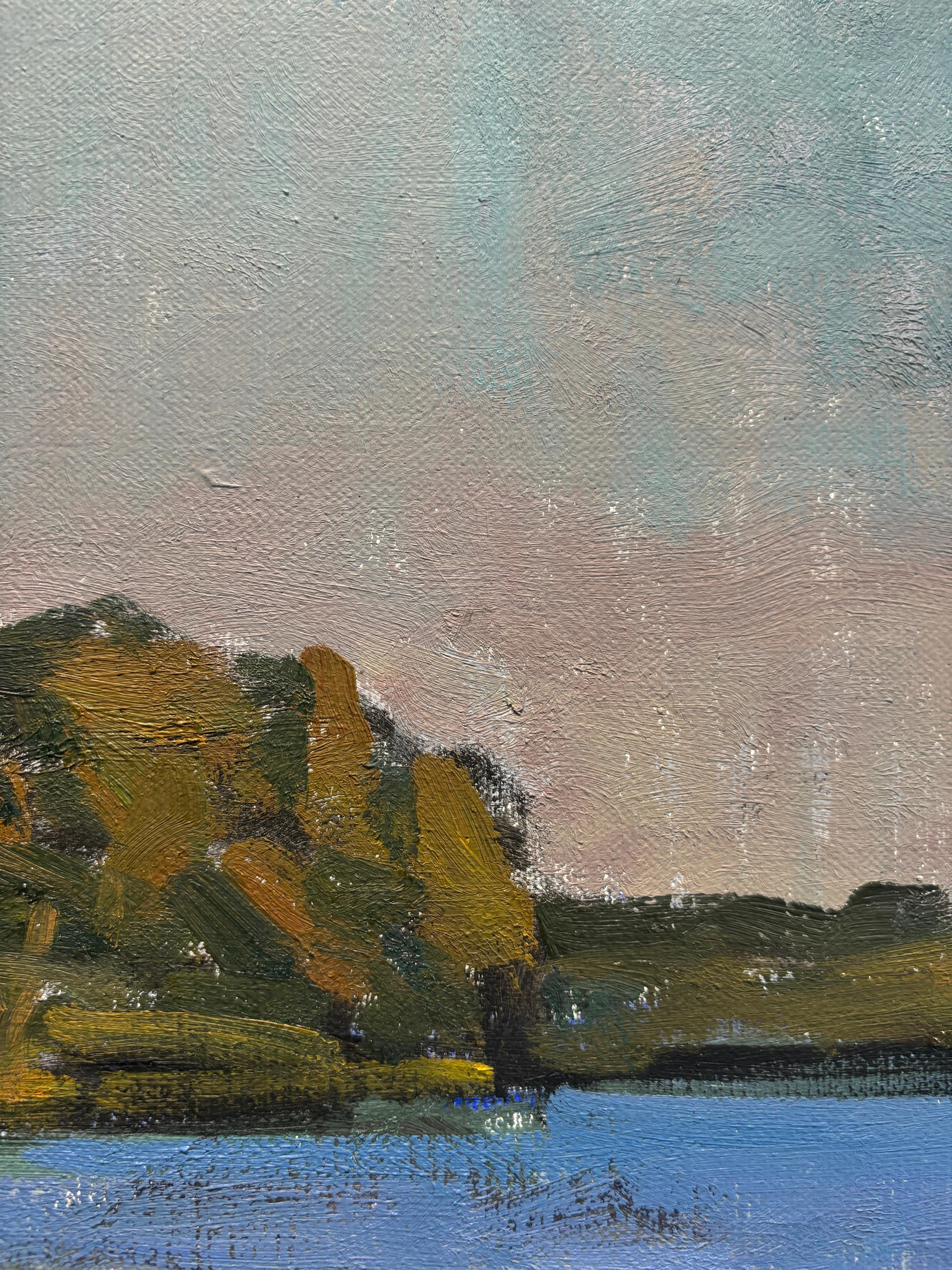 "Island Sunset" (2023) by Riley Doyle is an original handmade oil painting on panel of a shoreline with the sunset in the distance.