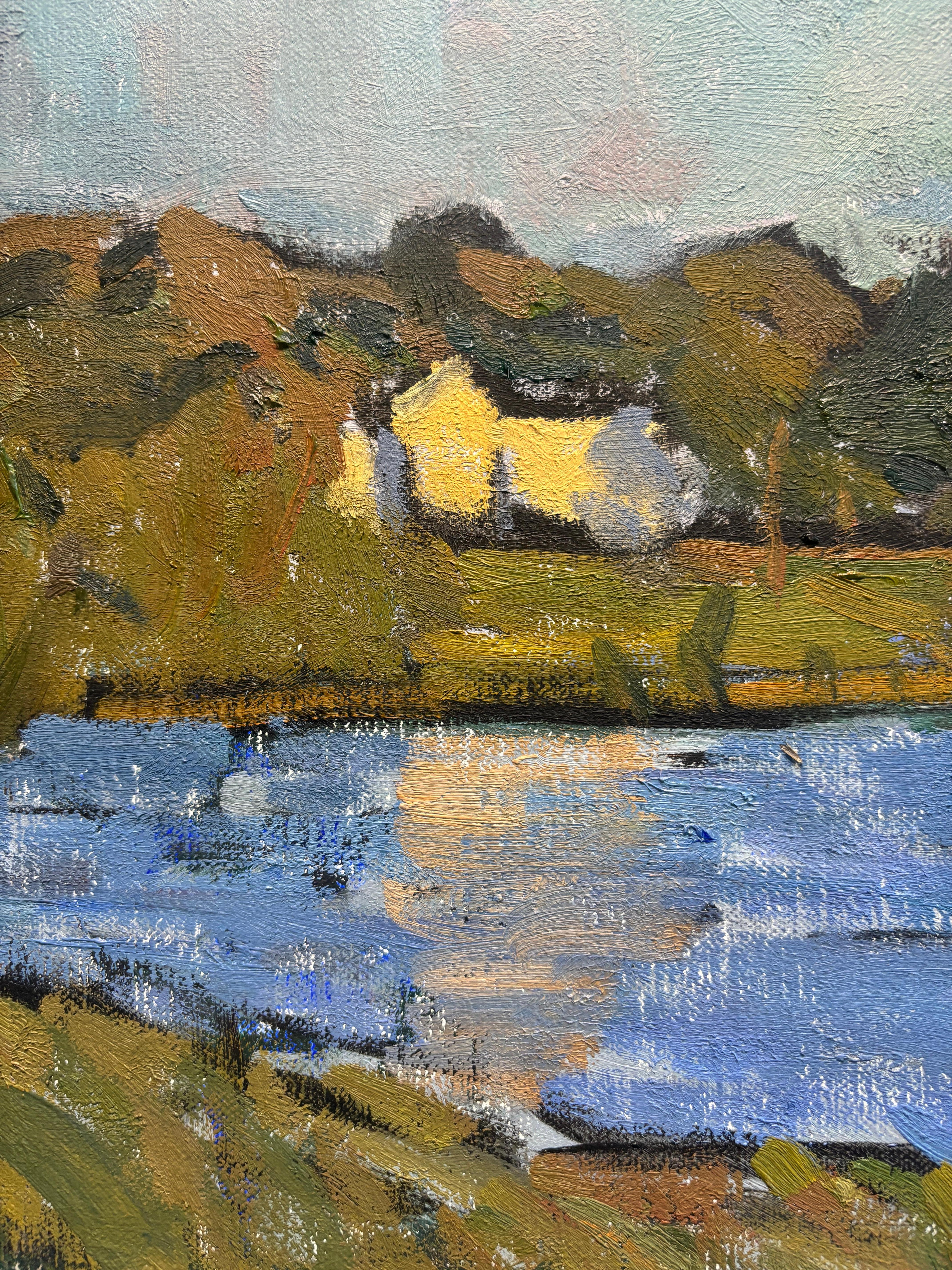 "Coecles Harbor, Golden Hour" is an Impressionist oil on linen painting by Viktor Butko. It depicts the Coecles Harbor with calm empty water, an empty blue sky, and a green grass landscape with a house in the distance.