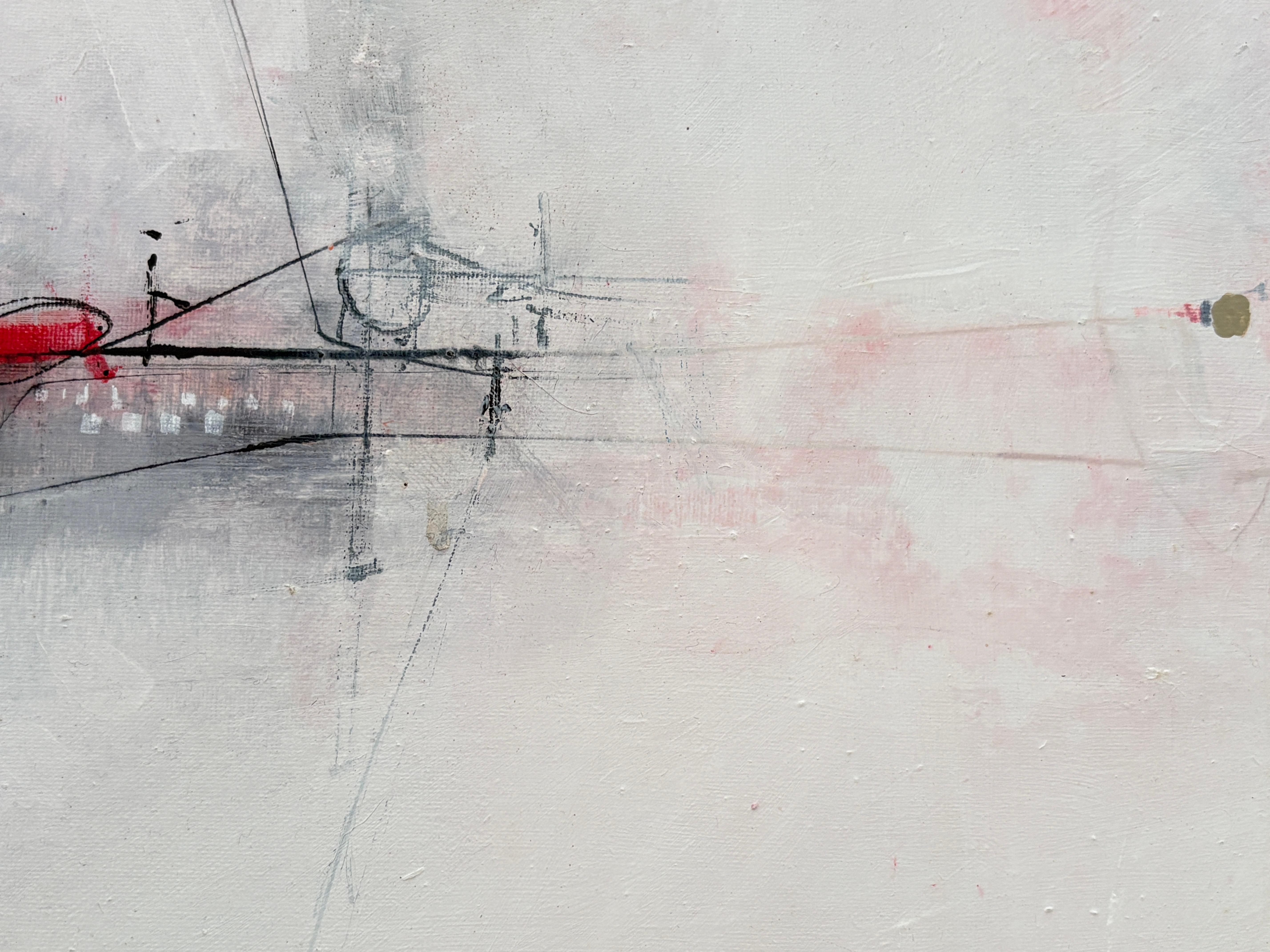 This urban landscape evokes a serene, almost dreamlike quality, reminiscent of early morning fogs cloaking a city awakening. Splashes of muted red and earthy greens flirt with the vast expanse of white, alluding to distant city elements. The painting's intricate lines and deliberate composition signify Mor's affinity for marrying the mathematical with the artistic. The deliberate placements and contrasts within the artwork underscore the balance and tension between the tangible and intangible, between clarity and obscurity.