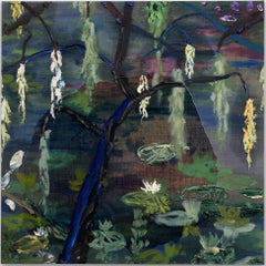 A textural oil painting by Darius Yektai (b. 1973 / Southampton, NY) of a tree over a pond filled with lily pads. A moody ground of colors, jewel tone purples, blues and greens, are ...