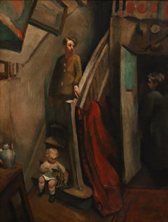 charming antique oil painting on wood board unsigned but attributed to the artist, Adolphe Deteix (1892-1967) see label on back, part of a private collection. Three women sit aroun...