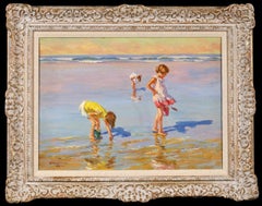 A beautiful 1930's Italian oil on canvas depicting sunset on the coast with sailing boats and figures on the shore, by Luigi Salvi. Excellent quality and condition work, signed lowe...