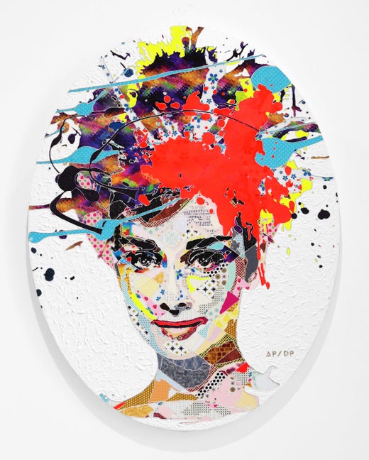 Alea Pinar Du Pre's original mixed media artworks portray human figures in a graphic pop-realist style. An enterprising autodidact merging technology and fine art, her vibrant contemporary pop-figurative artworks colorfully explore the territory between human reality and artificial reality. Her paintings portray the fact that our perceptions of solid reality are deceptively virtual. This unique collage is a part of her "Snapshot" series, as she explains: