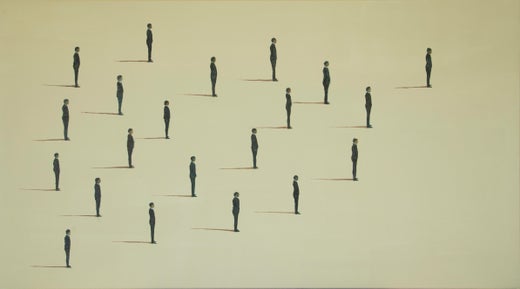 Each figure in his paintings appears as an isolated presence in a timeless, undefined space, inviting the viewer to look closer, to study its face and features. Suspended in vast, colour-soaked planes, the figures seem to be waiting, carefully positioned by the artist on the canvas. Yet they resemble fragile toy-like characters, wandering from one painting to another — without beginning or end.