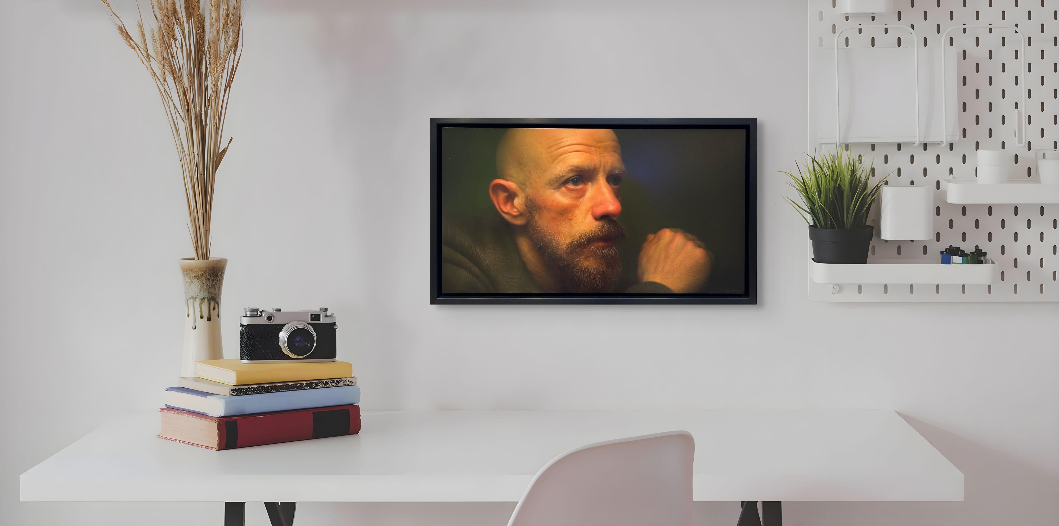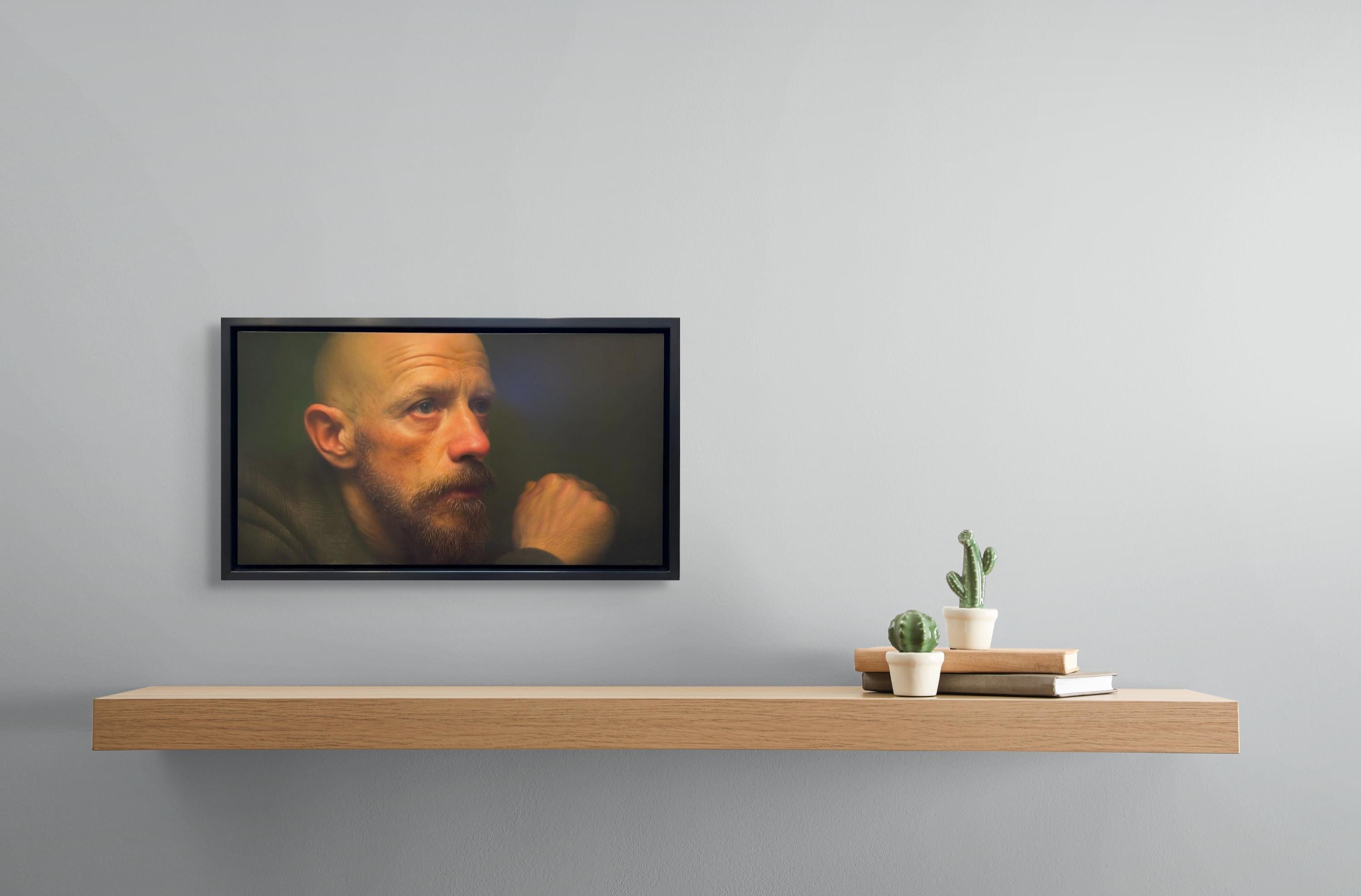 Lisa Fricker's "A Realist" is an original, handmade oil painting that depicts a portrait of a man deep in thought, it measures 8 x 8 inches. This painting is framed and ready to hang...