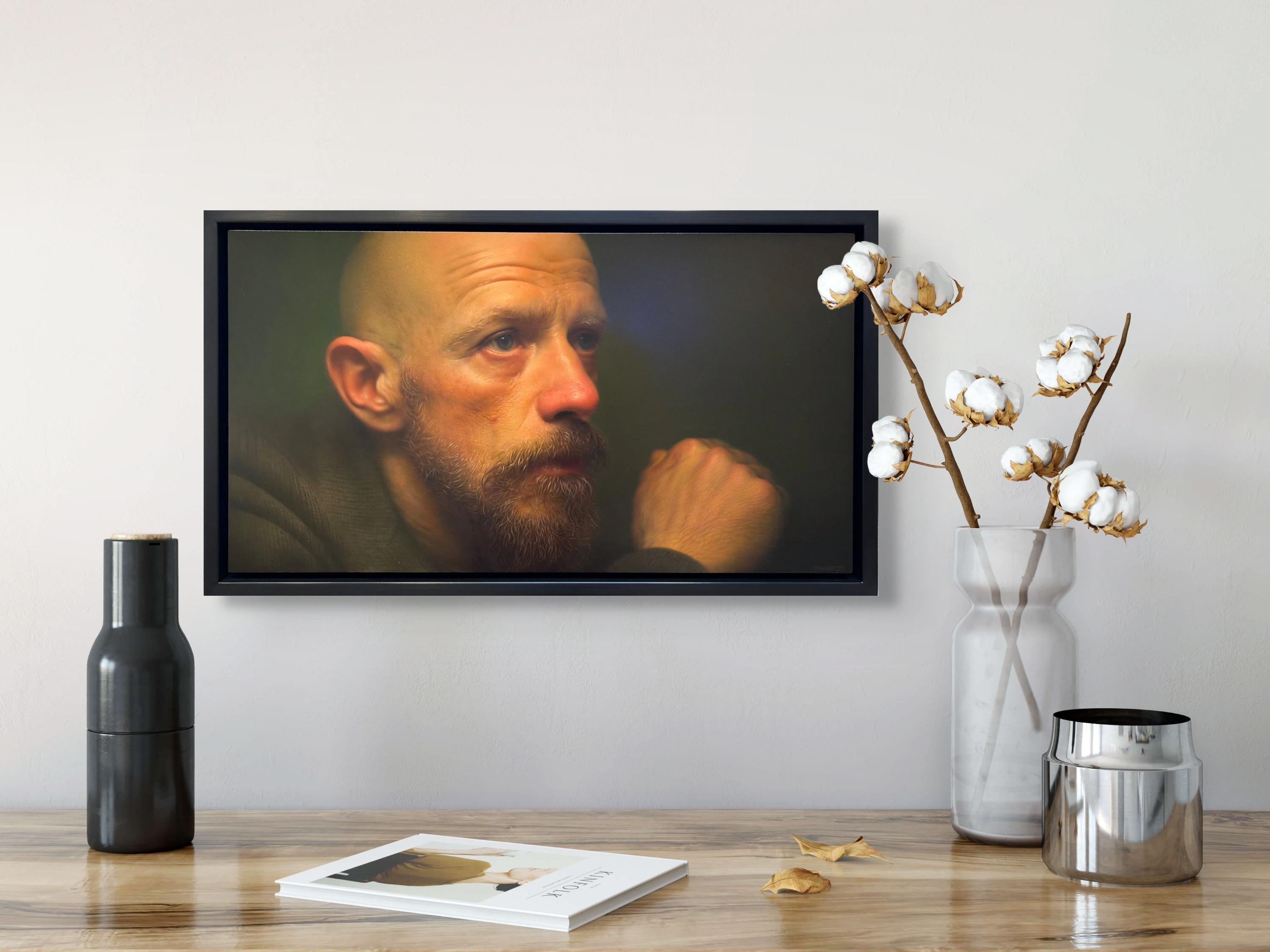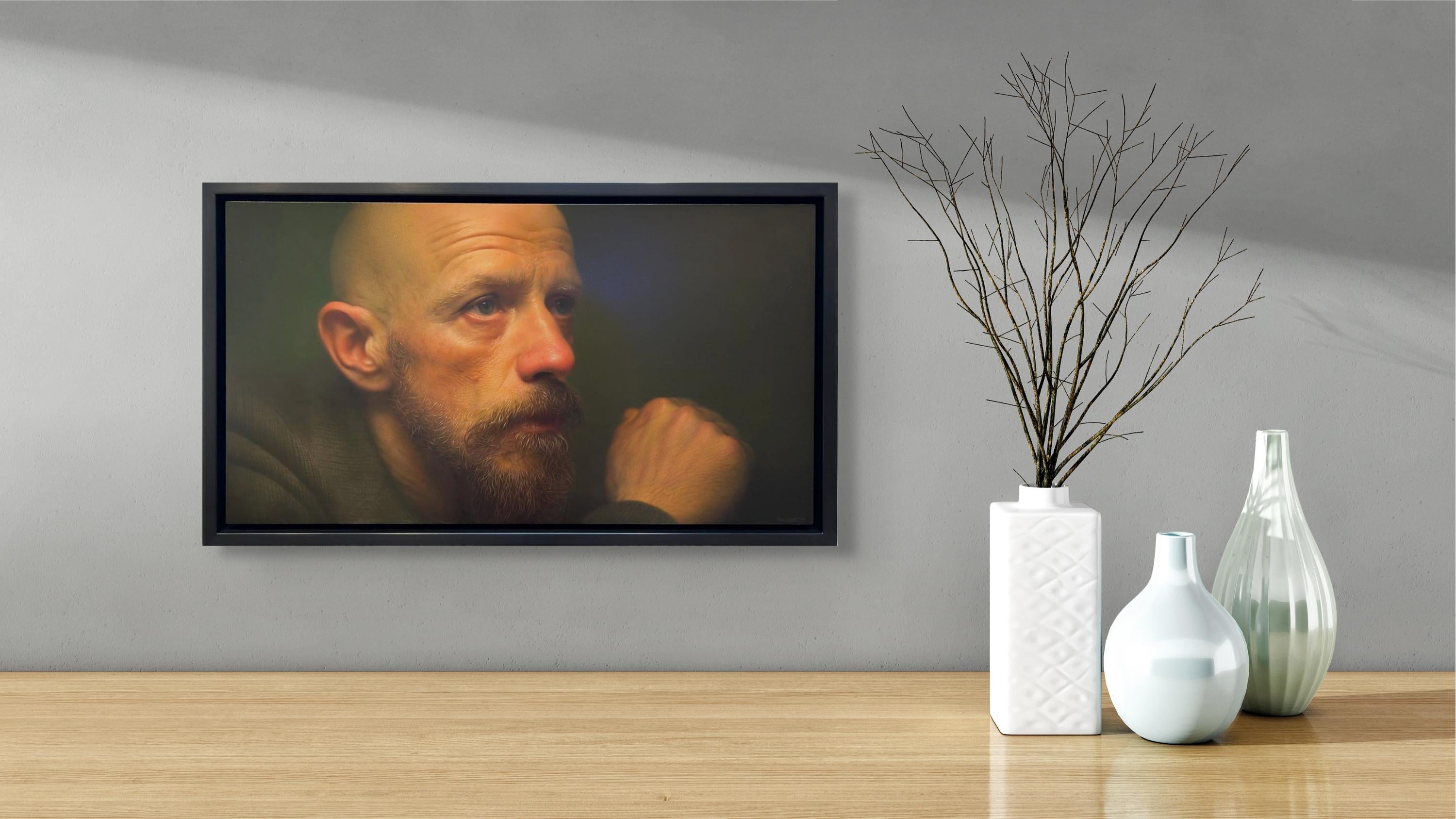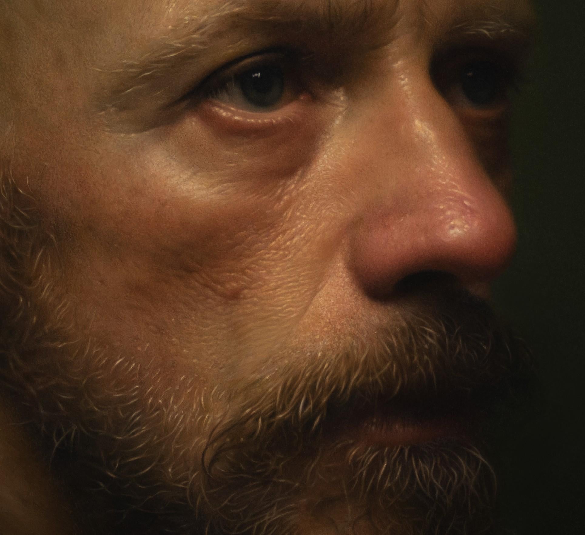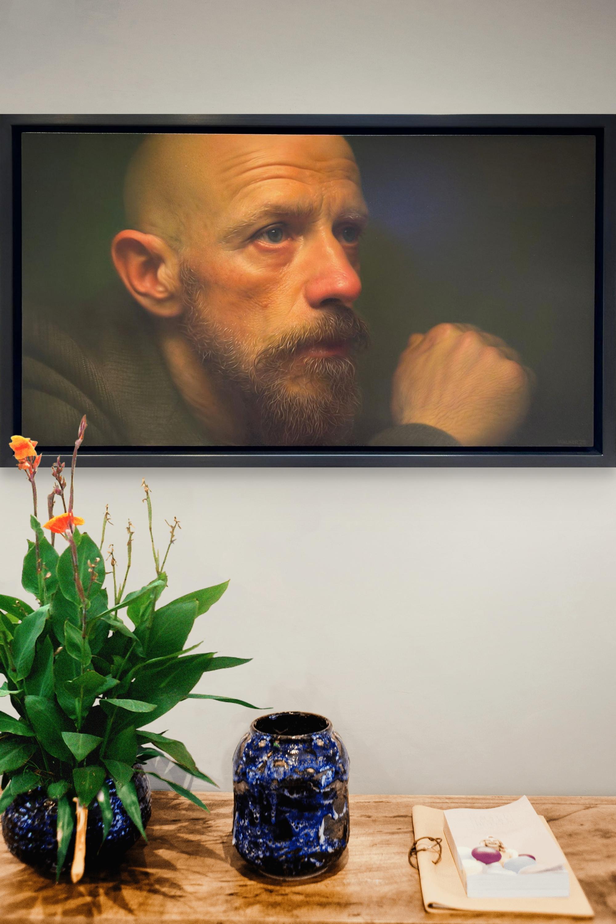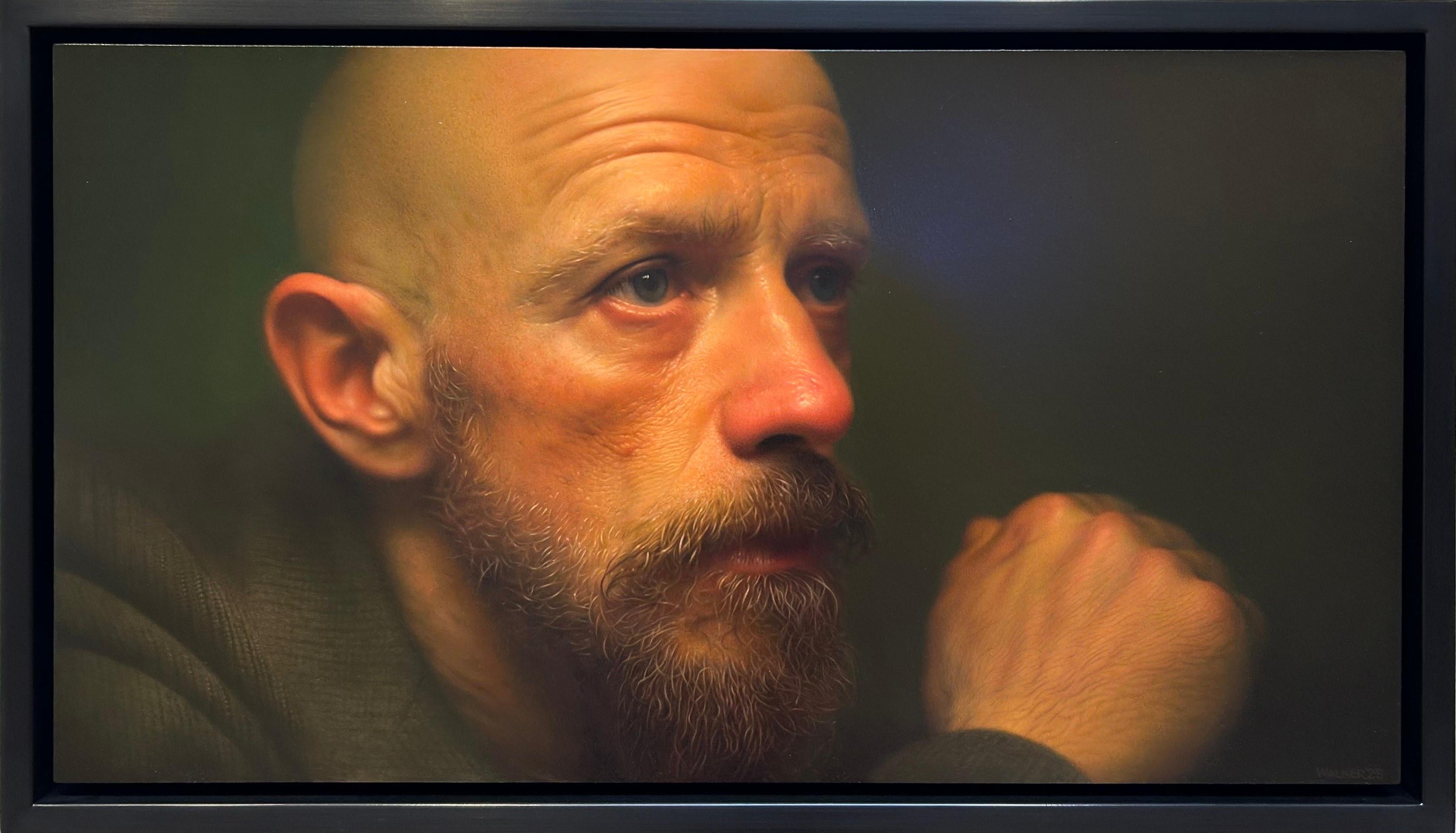 Jason Walker's (CAN based) "Liam" is a masterful photorealist oil portrait that depicts a middle-aged man, in the midst of deep philsophical thought.