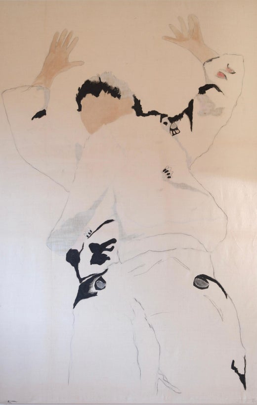 Study for Jo III, modern fabric painting with nudes, by Anne Valérie Dupond