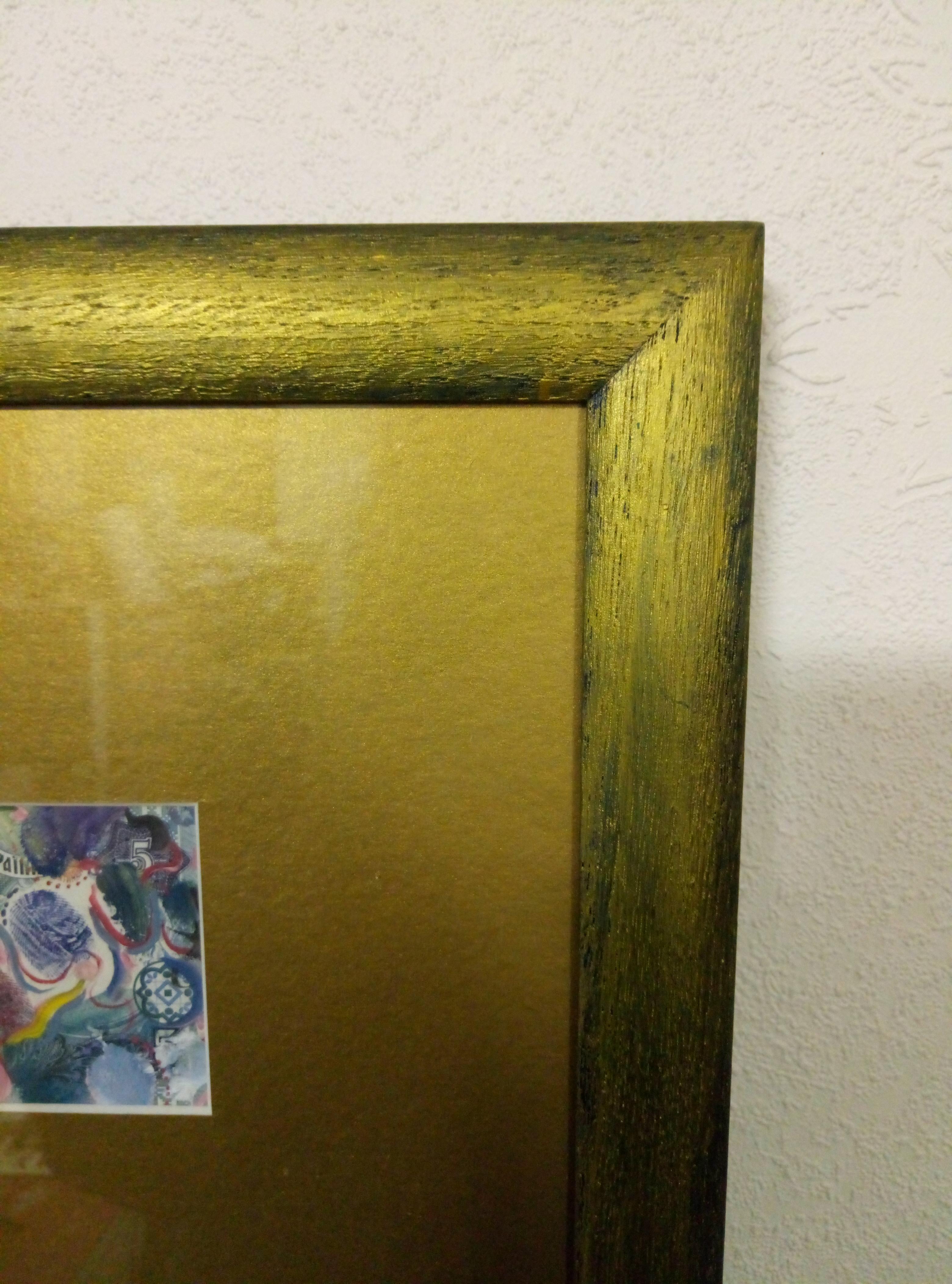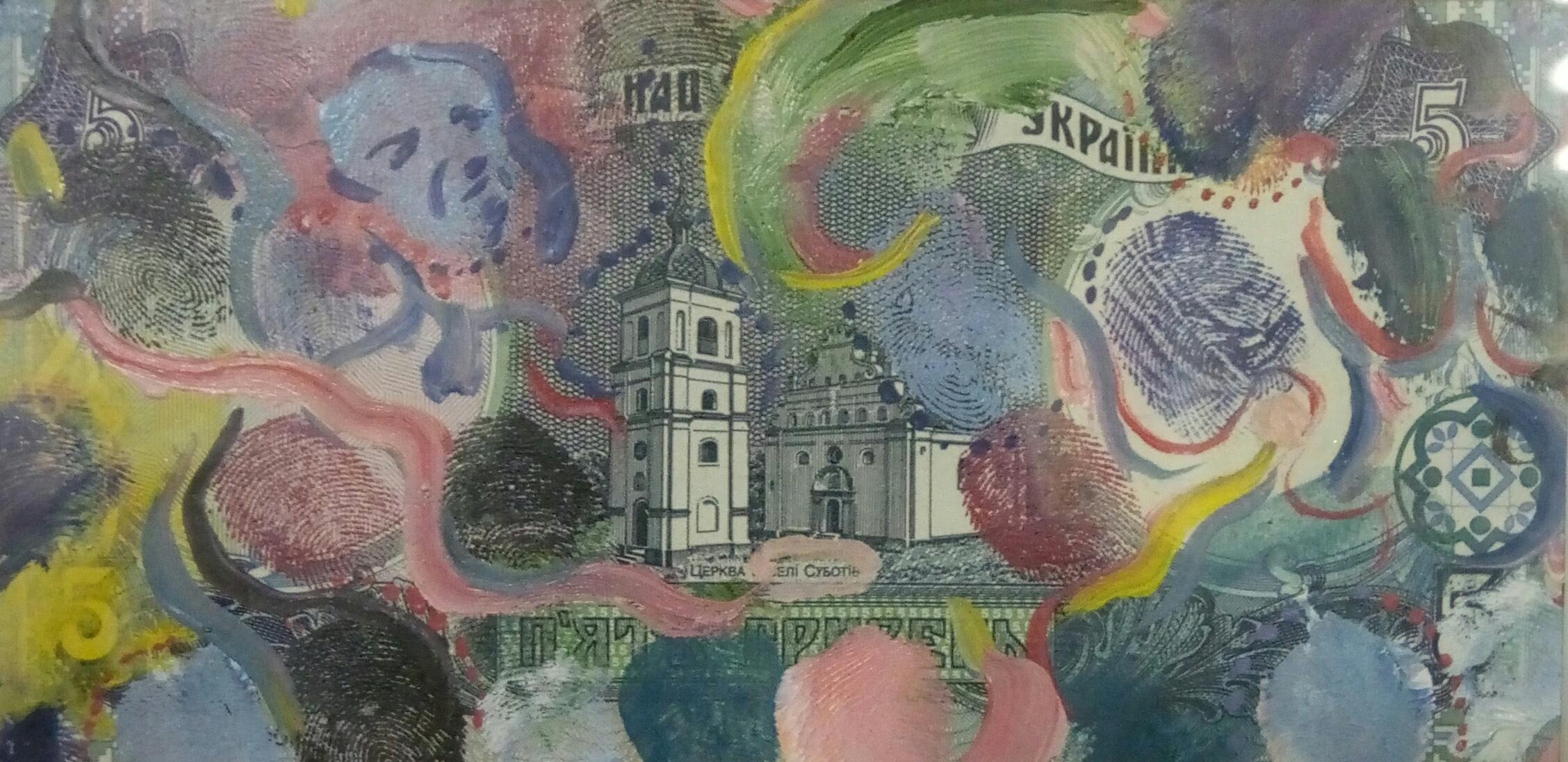 The painting is painted on a Ukrainian 5-hryvnia banknote. The frame is made of oak and plastic.