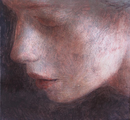 Rudolf KosowFragment 2 (dreamy woman portrait face painting on wood, soft Earth tones)2024