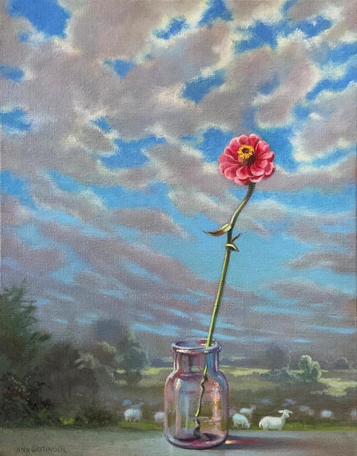 Ann GetsingerFlock and Zinnia (Pink Zinnia Still Life Painting w/ Sheep and Cloud Landscape)2021