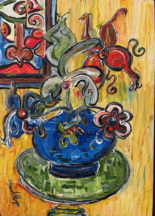 Chinese Blue Vase with a glimpse of Harpers painting People Watching in the background. This is a bold and vibrant impressionist still life painting from...