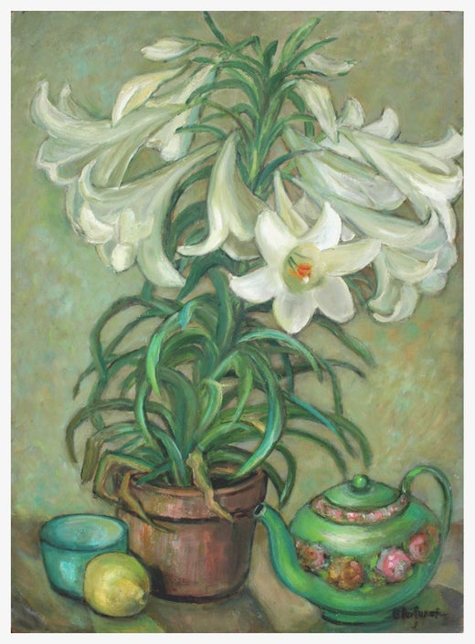 Gorgeous mid-century still life of a vase of white lilies next to a green teapot and lemon by listed California artist Helen Enoch Gleiforst (American, 19...