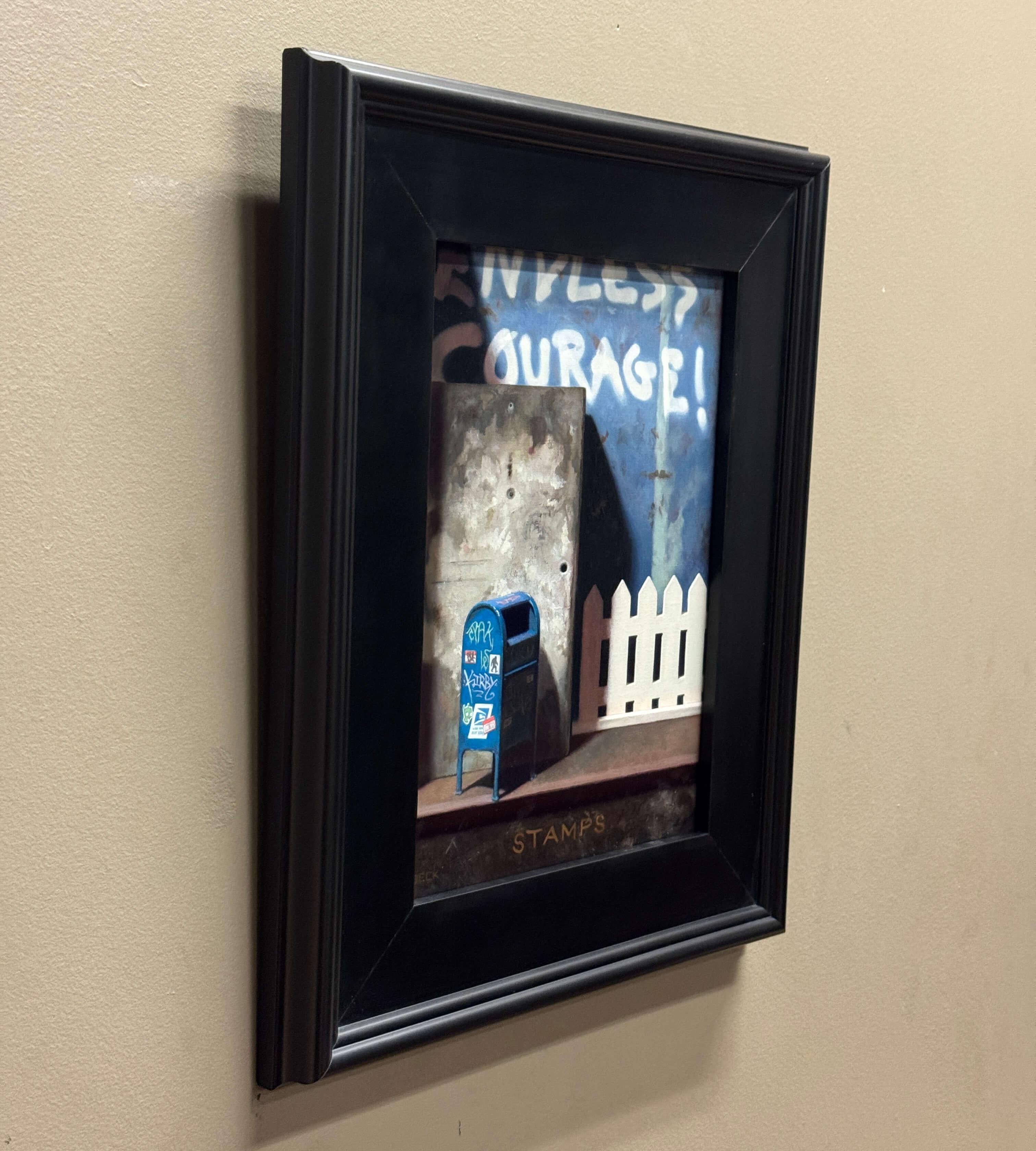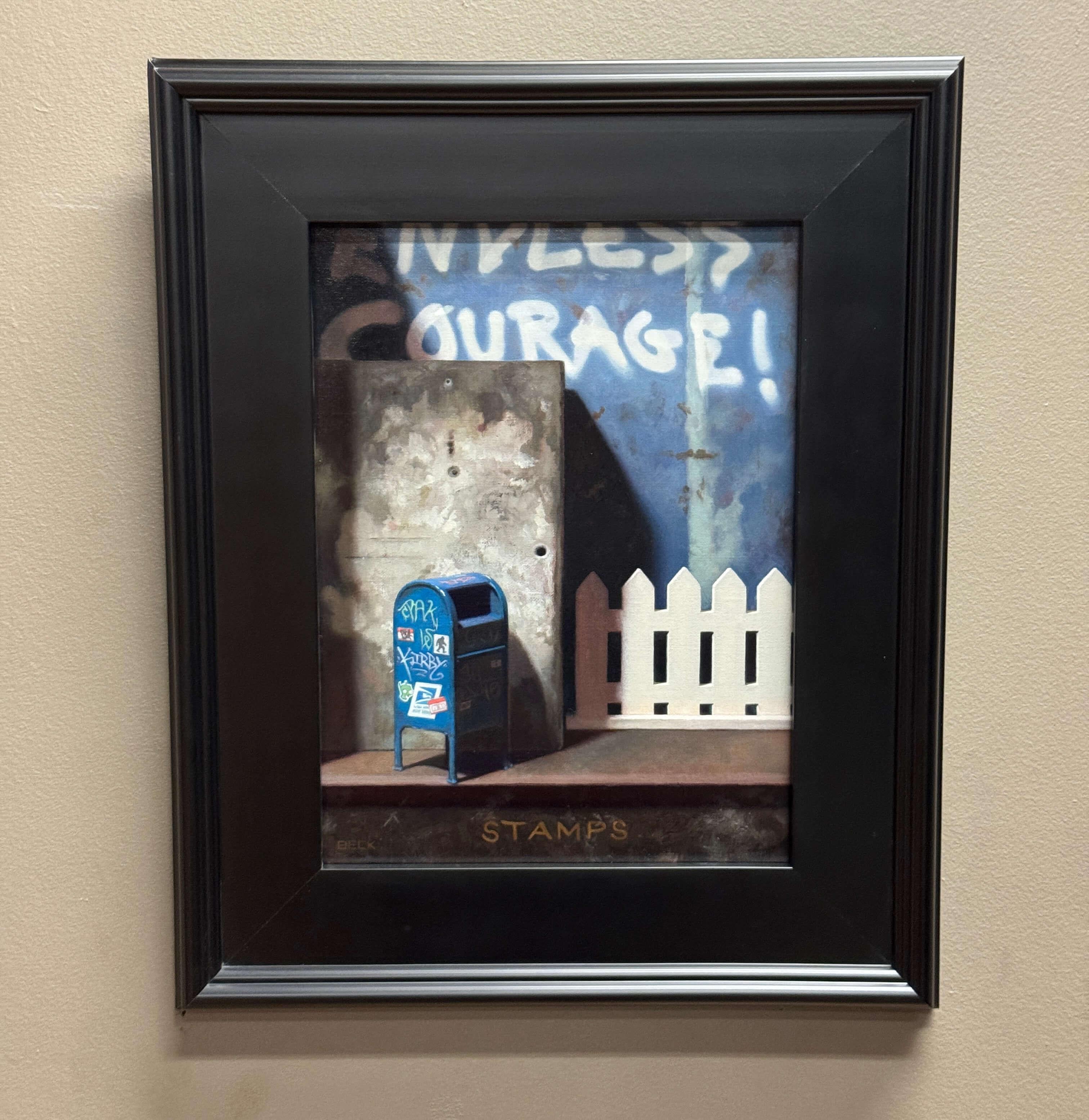 Julie Beck's "Angels in the Architecture" is an oil painting on canvas that measures 17 x 14 inches framed and is ready to hang.