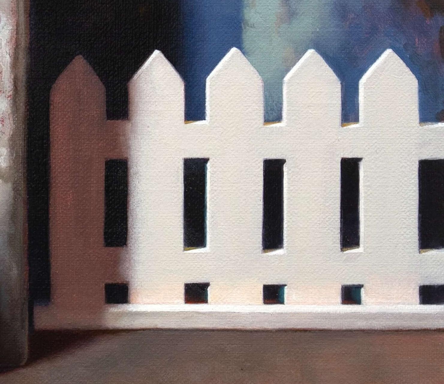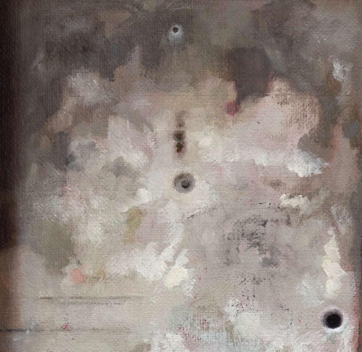 Robin Cole's (Us based) "Beginnings" is an oil painting that depicts a window partially blocked with a white curtain, with the contending light and shadows making patterns on its for...