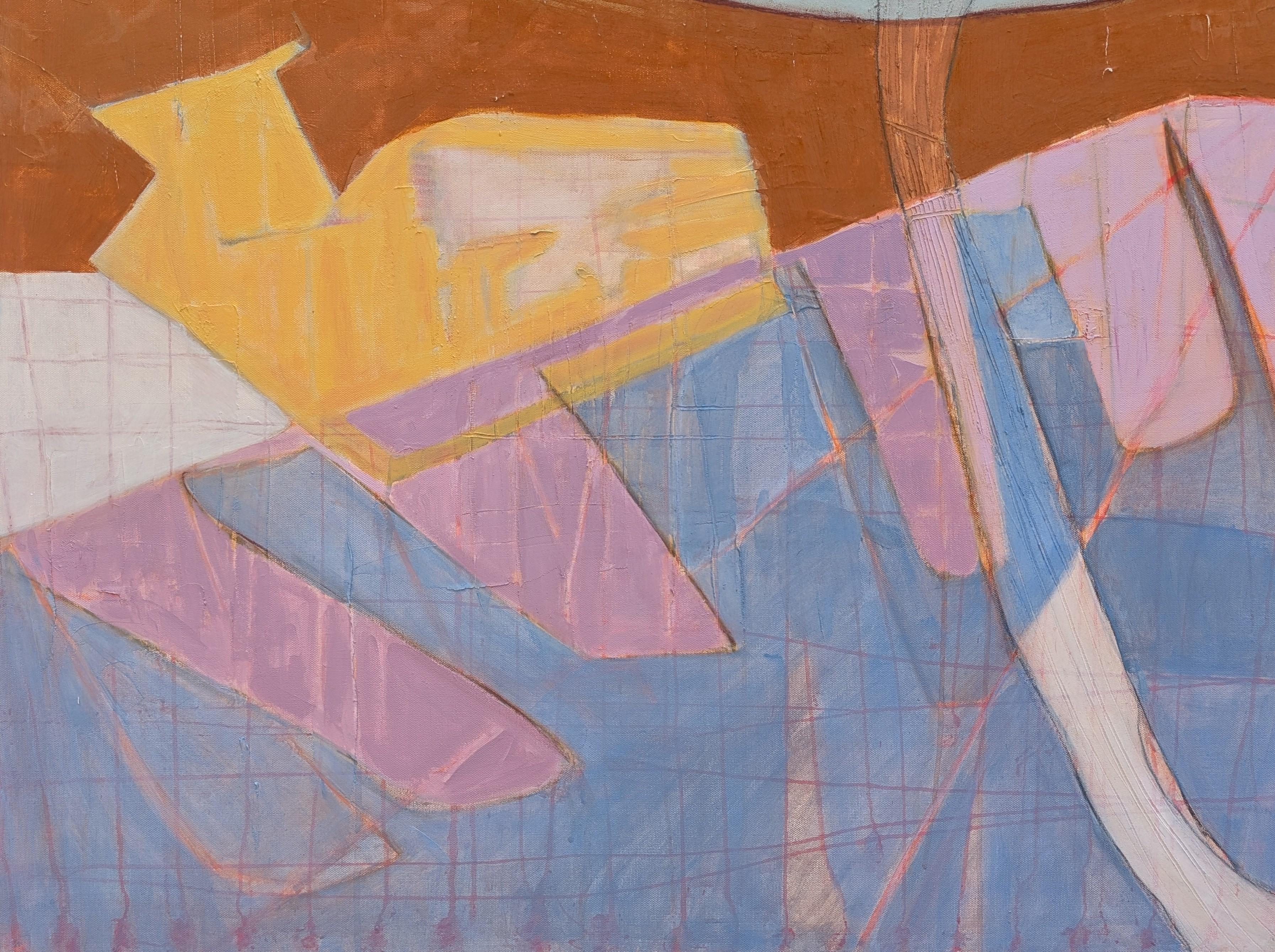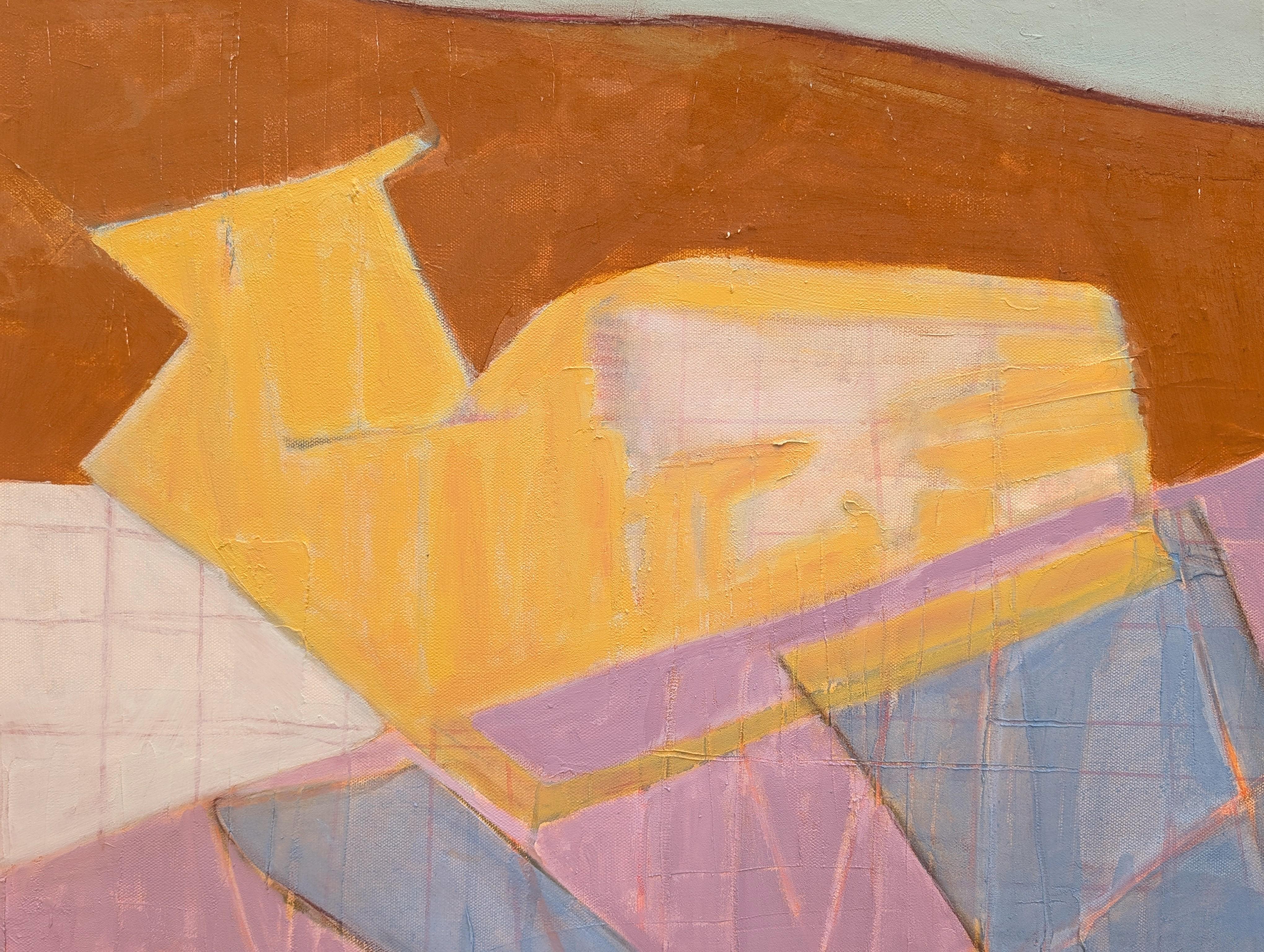 Contemporary colorful pastel toned abstract still life painting by Houston-based artist Kristen Anton. The work features a field of burnt orange accented by a yellow vase abstractly portrayed sitting on a pink and purple table. Signed, titled, and dated on the reverse. Currently unframed, but options are available.