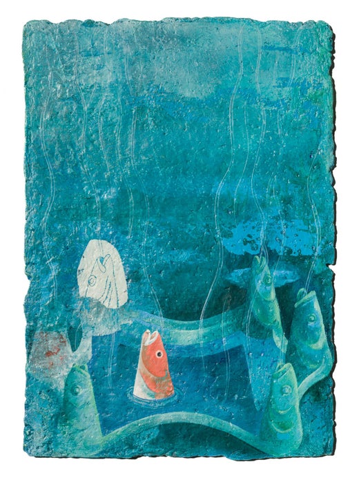 View All"Rest", Terracotta Textured Hand-made Paper with Fish Water Fountain in Oil