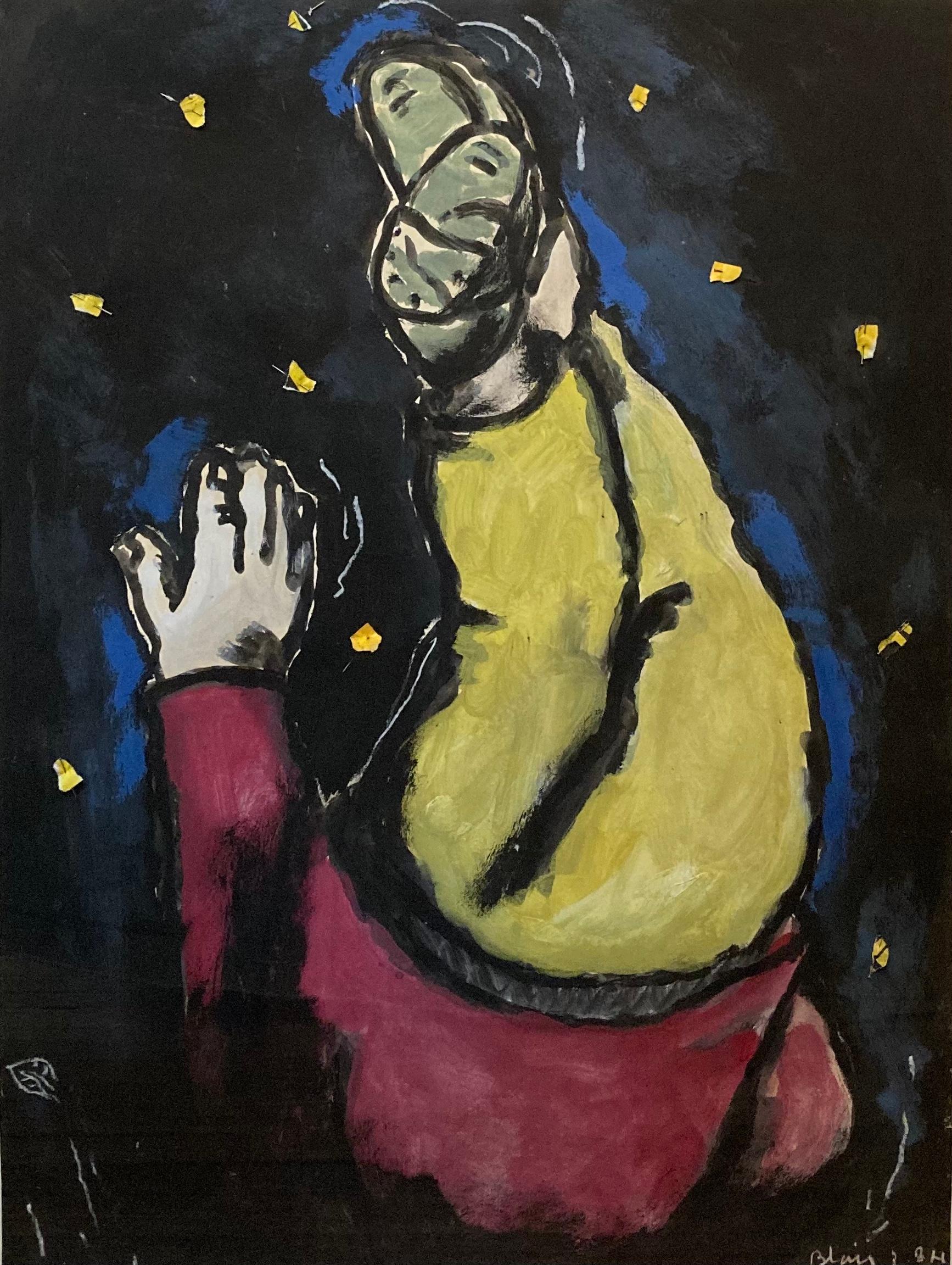 Abstract composition of blue, purple, orange, red, yellow, and black geometric shapes on rolled canvas tube.